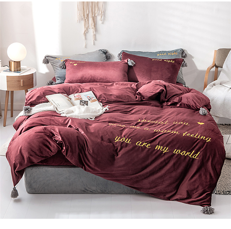 北纬27度 2019新款流苏刺绣加厚宝宝绒四件套 妩媚酒红