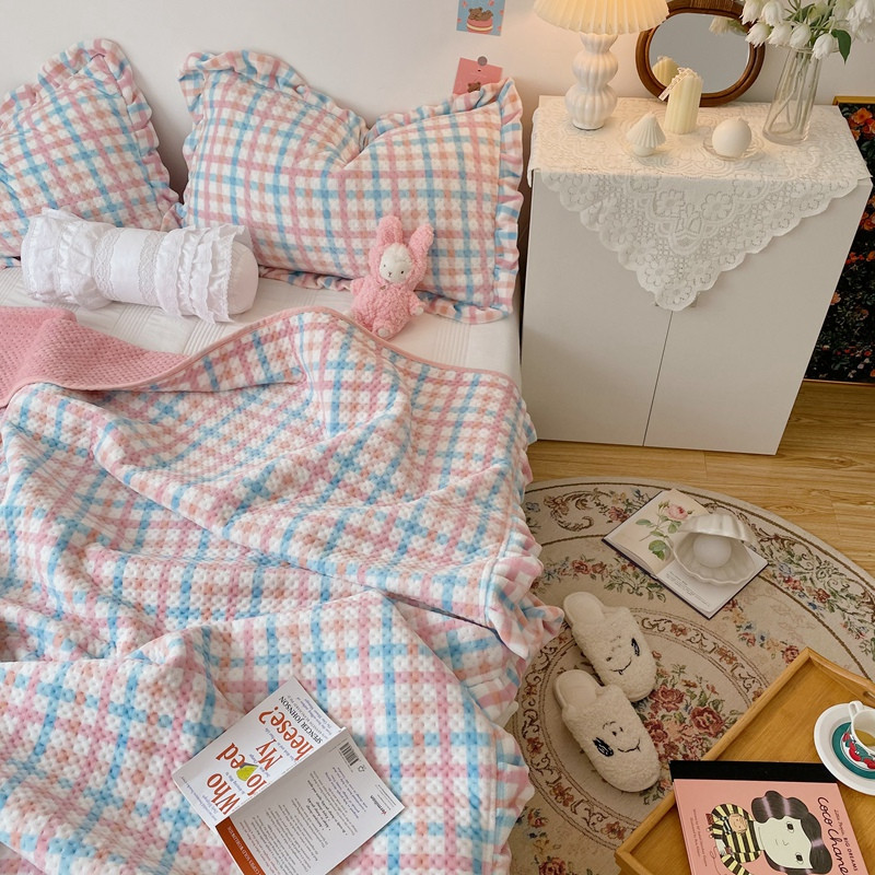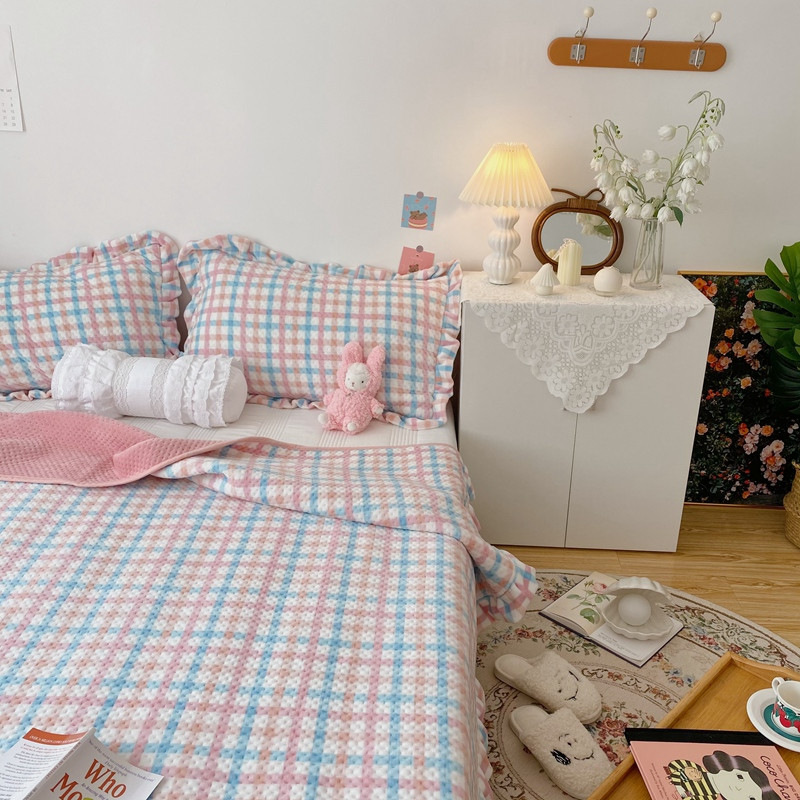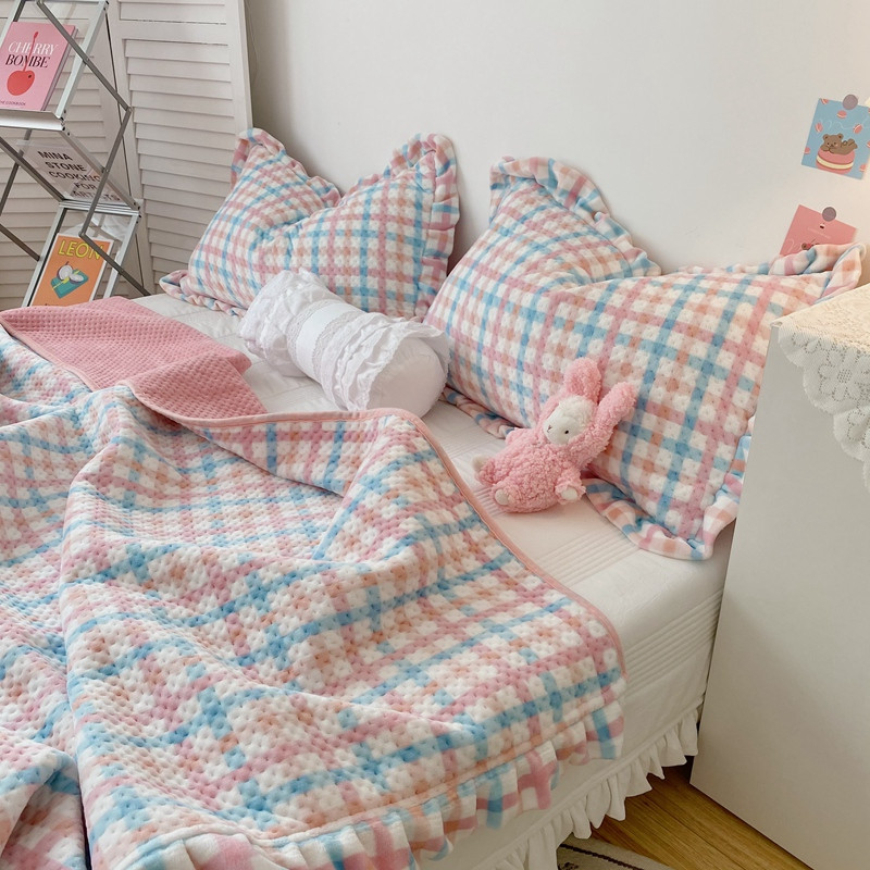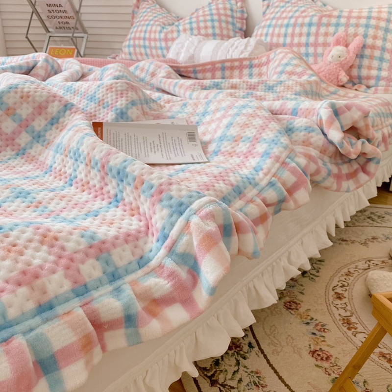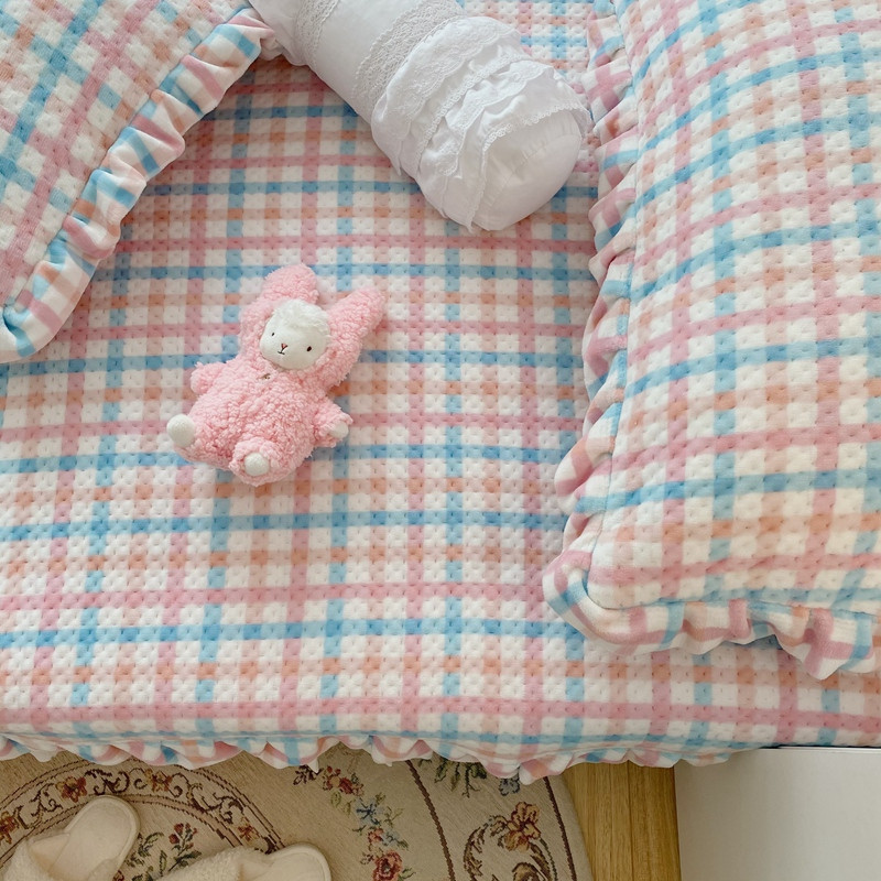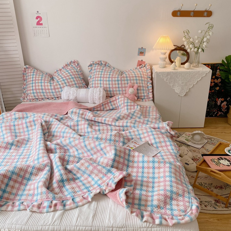 商品名称:星期八 2020新款奶油色花边牛奶绒床盖 格子粉