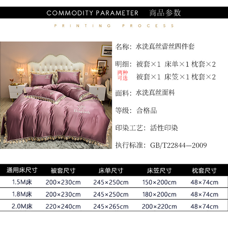 商品名称:米奈家居 2021新款水洗真丝蕾丝花边爱琳四件套 紫粉