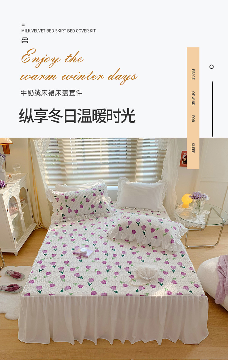 眠屿ins仙仙的牛奶般丝滑韩版牛奶绒床裙床盖三件套紫色郁金香