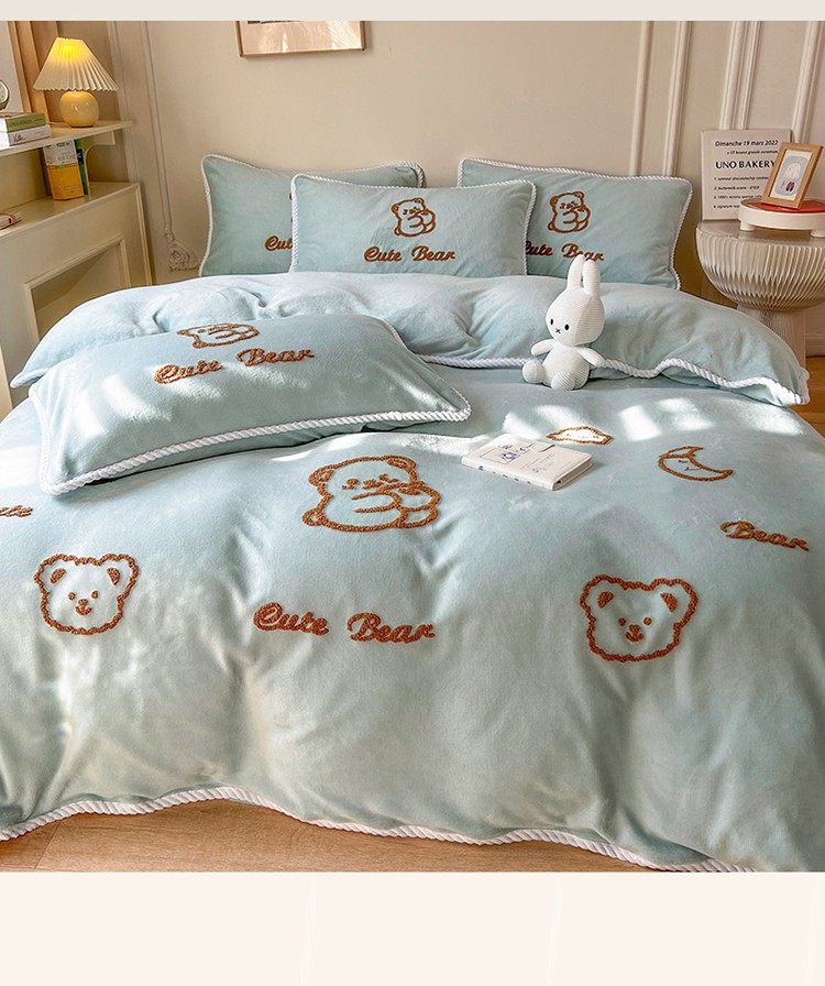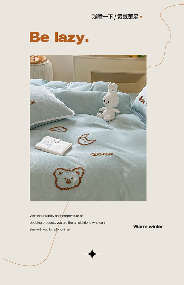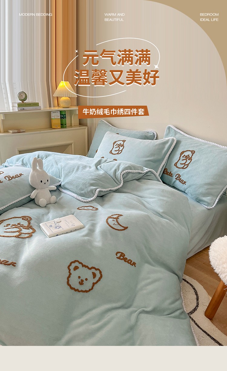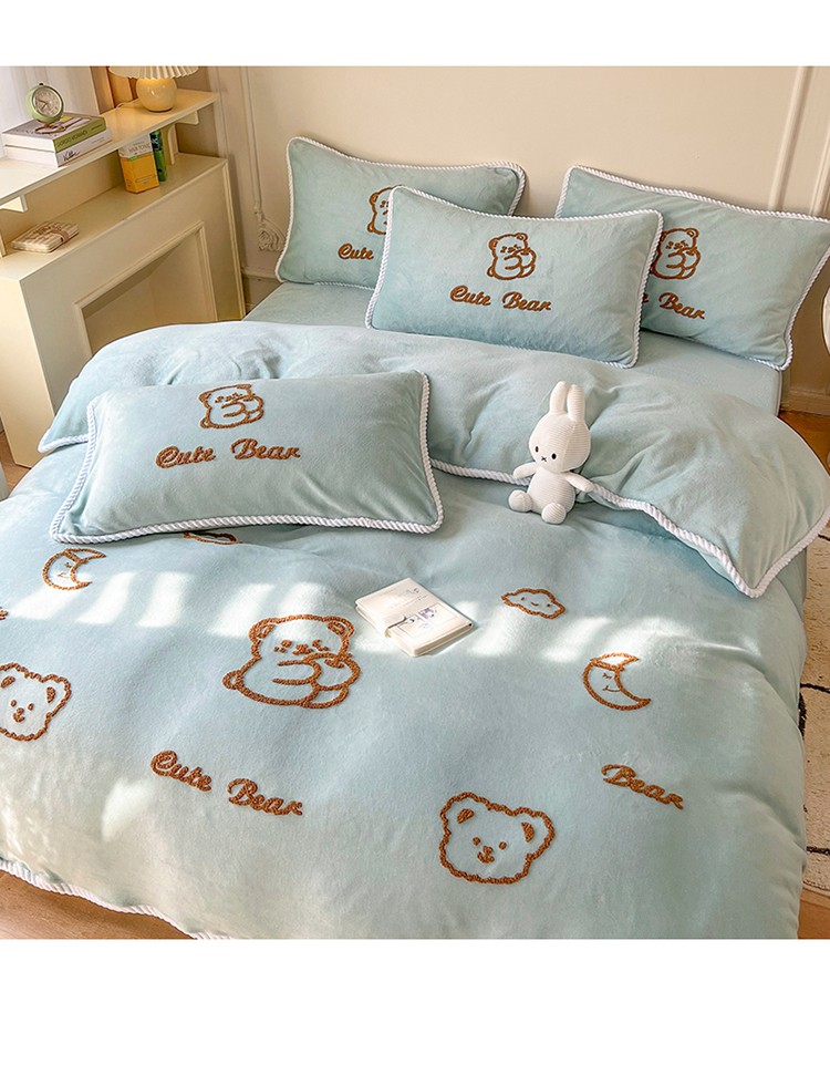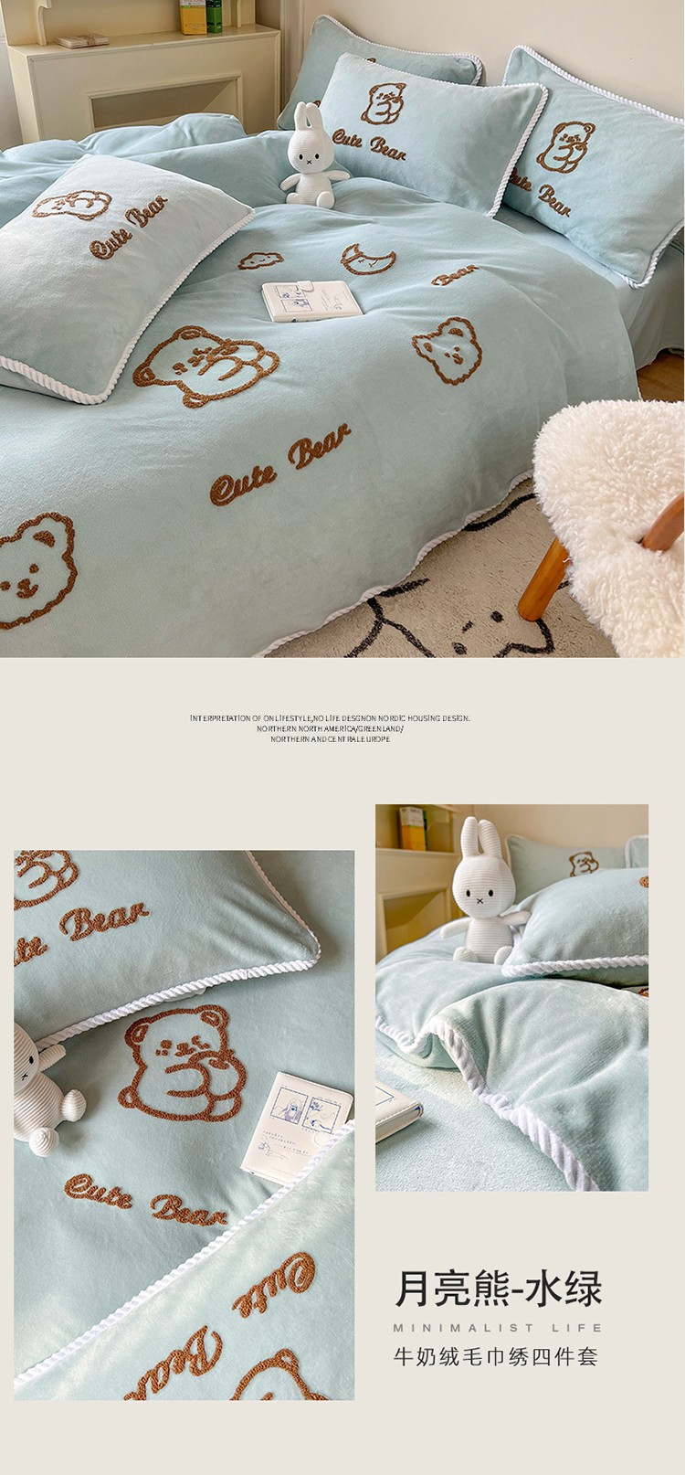 芯贝儿 新款加厚保暖雕花牛奶绒毛巾绣花宝宝法莱绒四件套 月亮熊-水绿