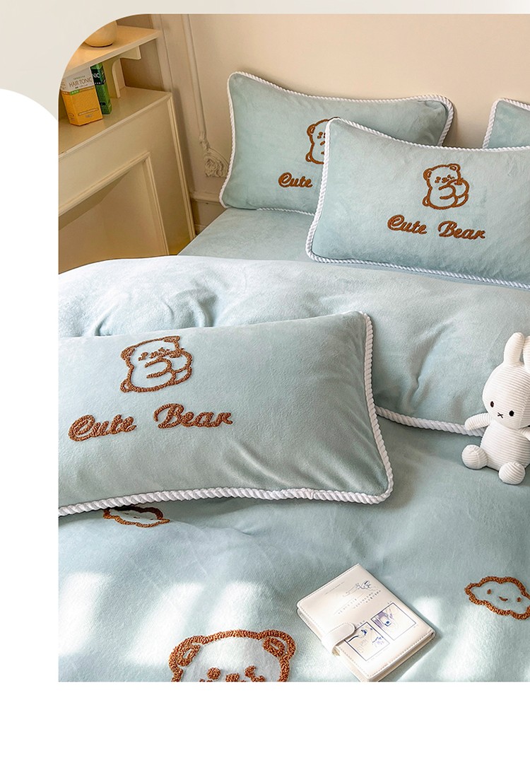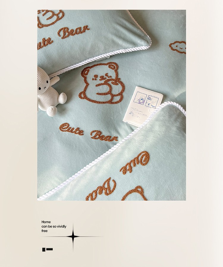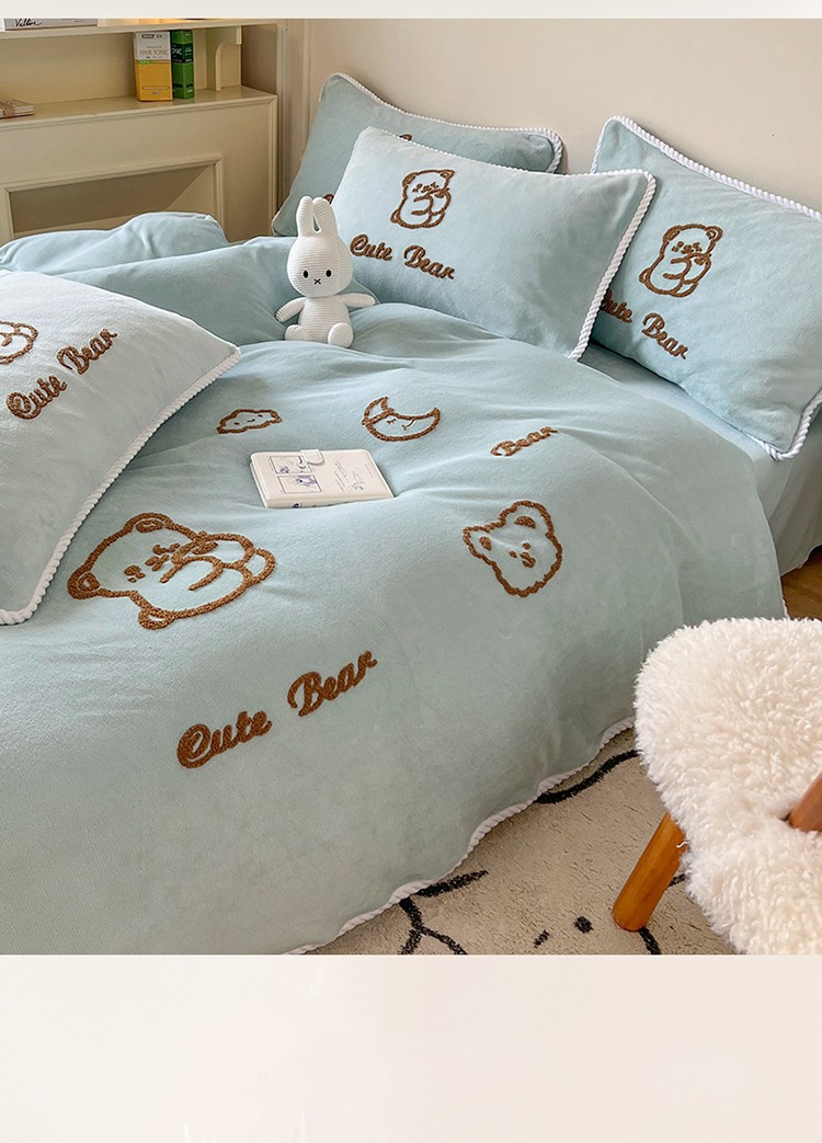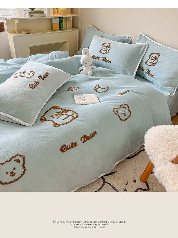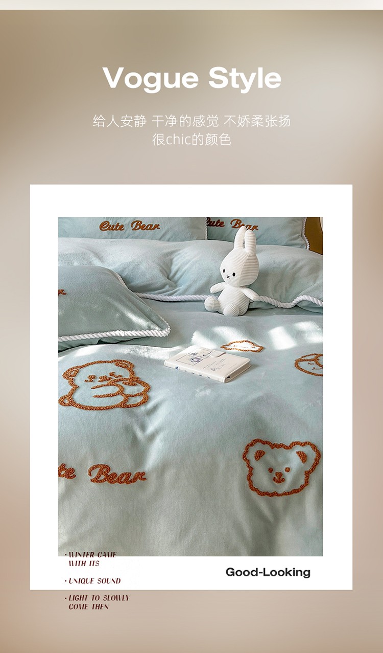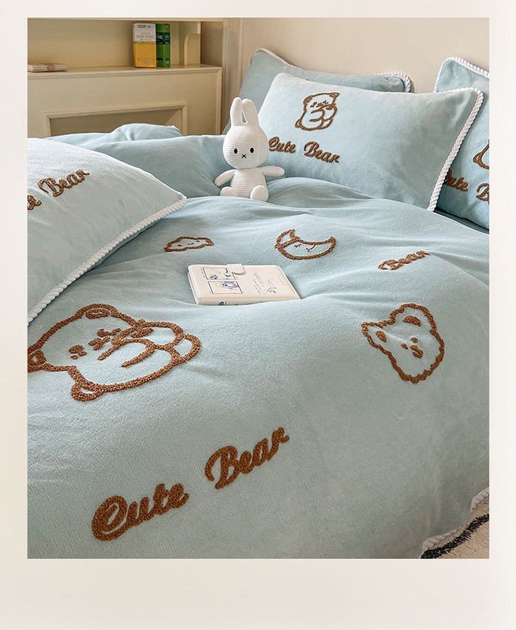 芯贝儿 新款加厚保暖雕花牛奶绒毛巾绣花宝宝法莱绒四件套 月亮熊-水绿