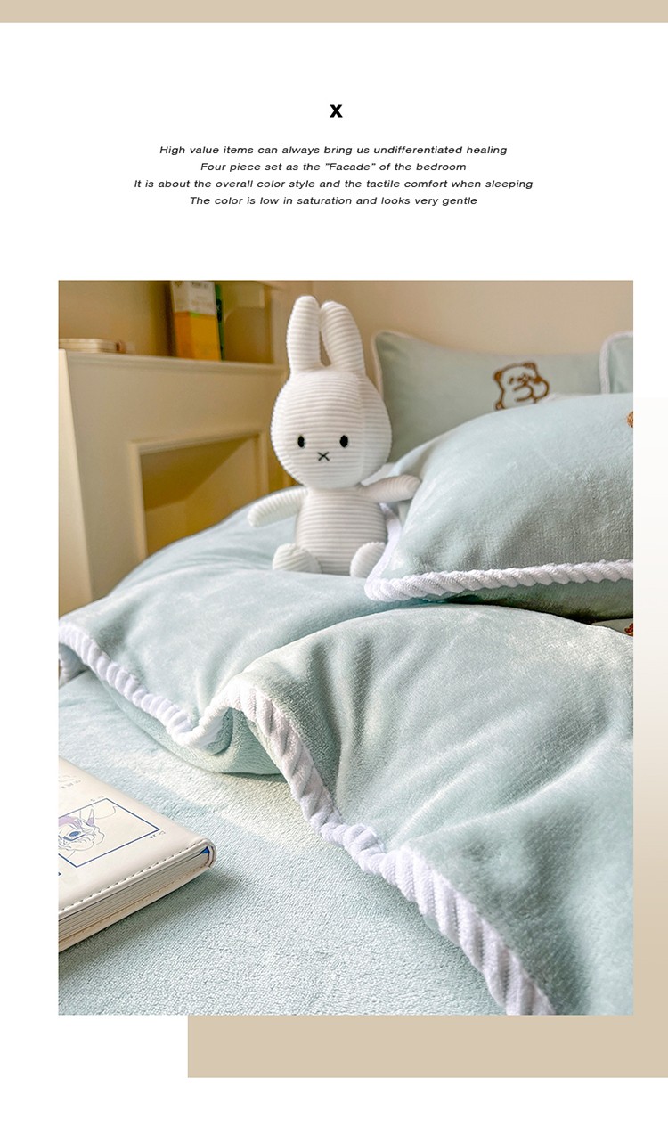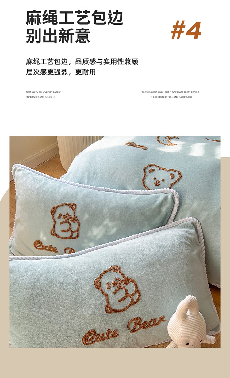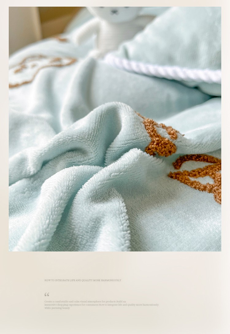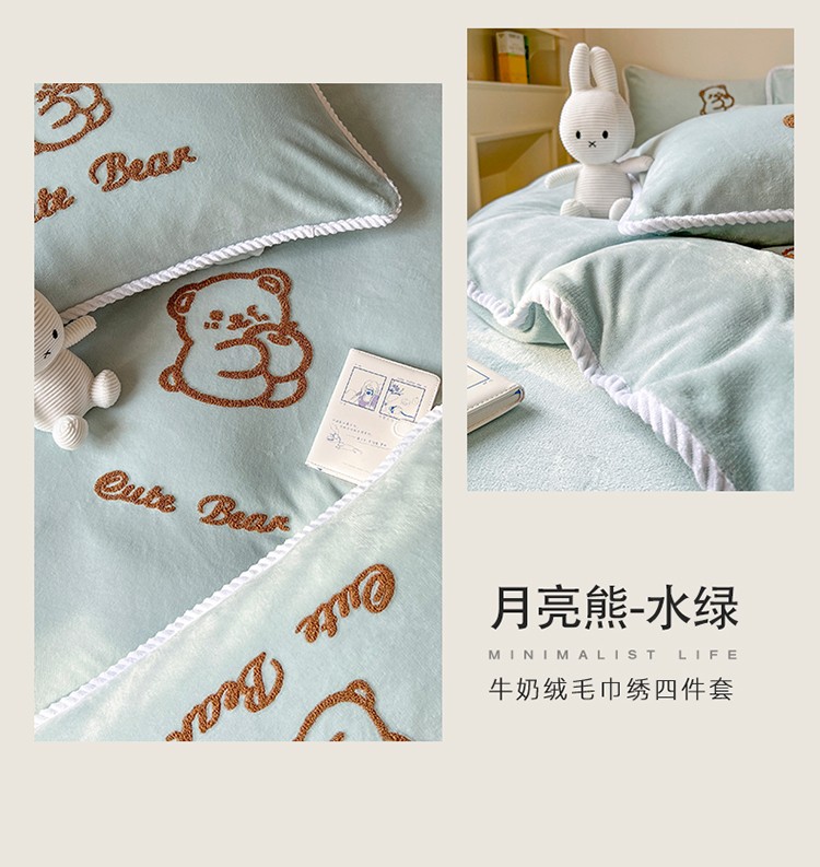 商品名称:芯贝儿 新款加厚保暖雕花牛奶绒毛巾绣花宝宝法莱绒四件套 月亮熊-水绿