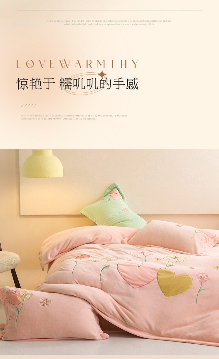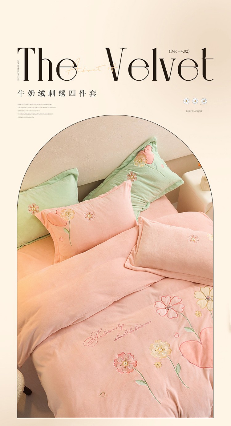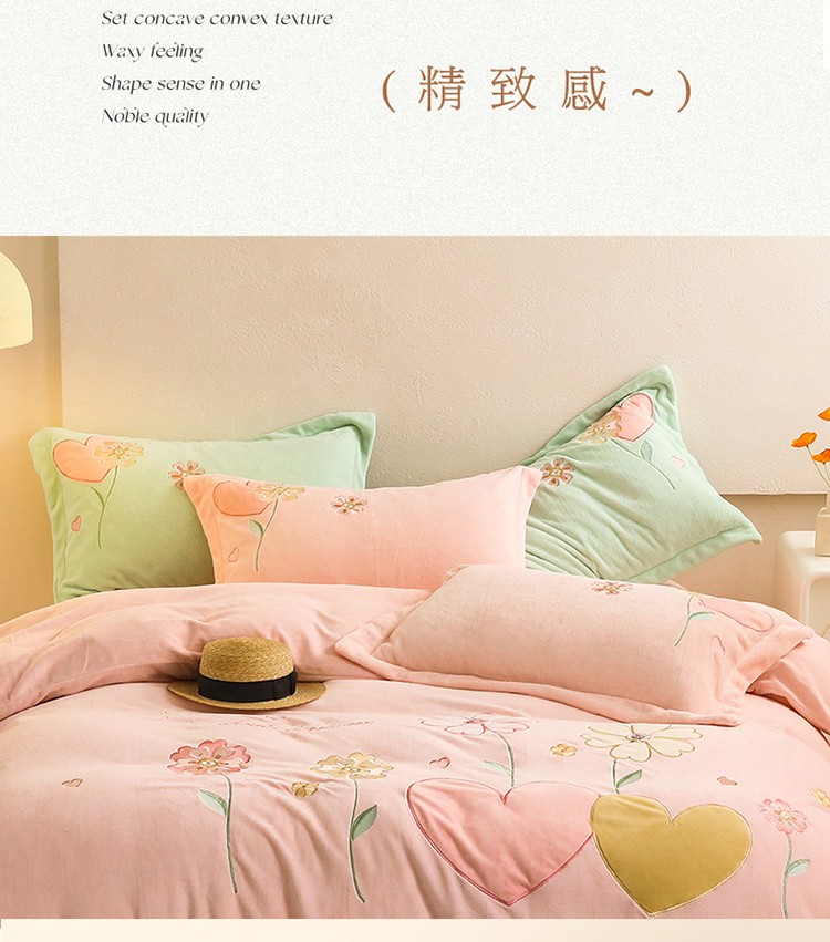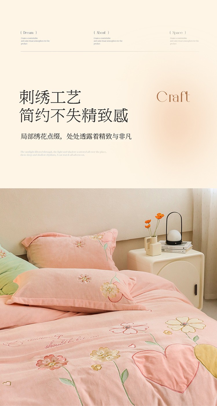 名品优仓2022新款大贴布绣刺绣牛奶绒230克四件套彩色甜心 少女粉