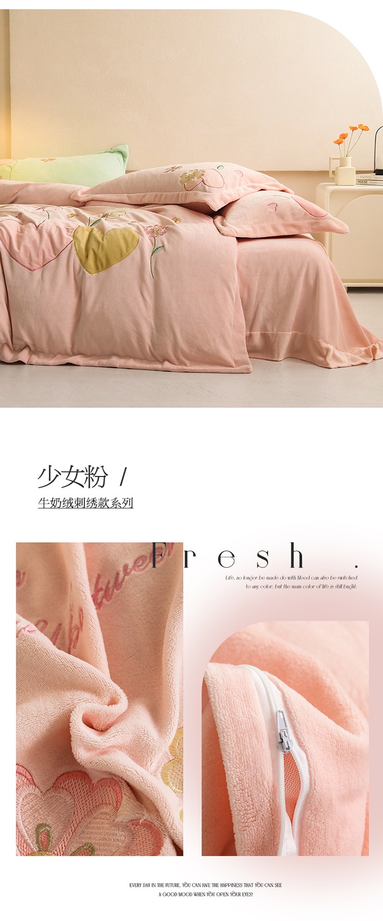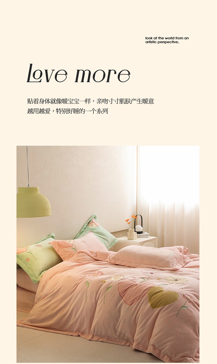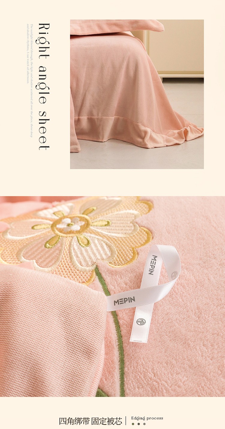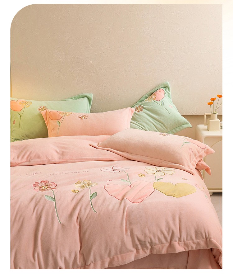 名品优仓2022新款大贴布绣刺绣牛奶绒230克四件套彩色甜心 少女粉