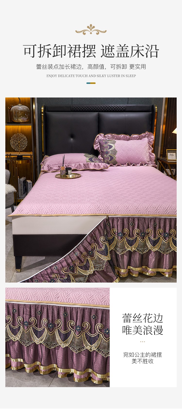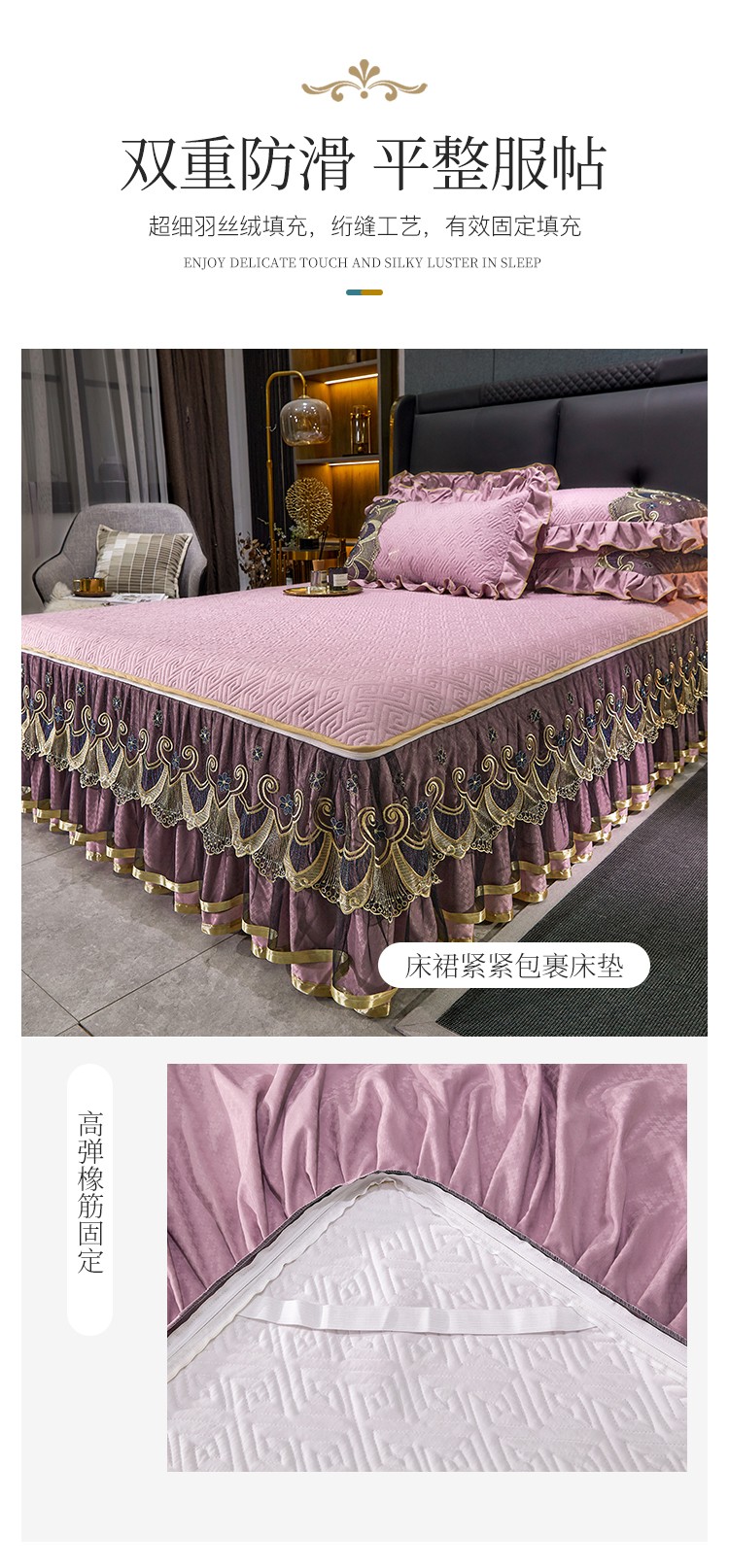 罗艺轩 2024新款贡缎提花夹棉床裙三件套千鸟格系列 千鸟格-香妃粉