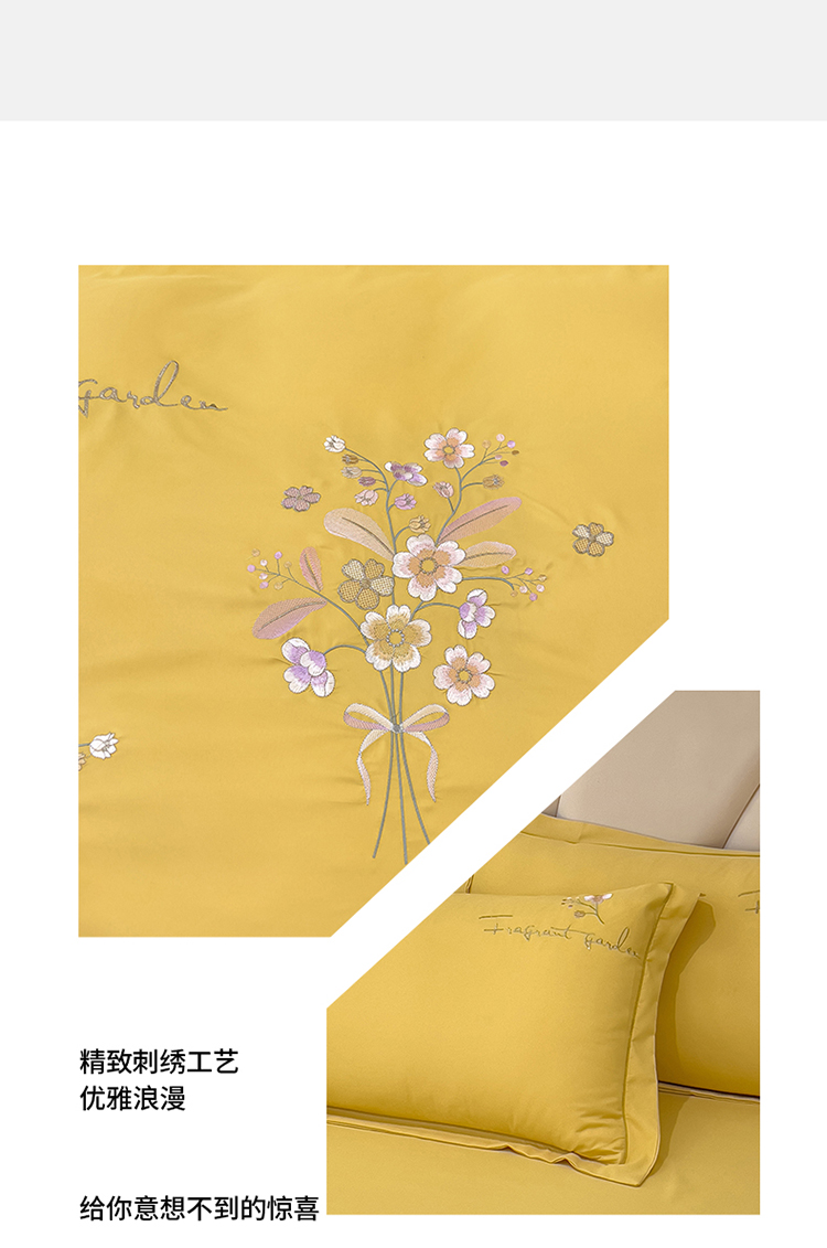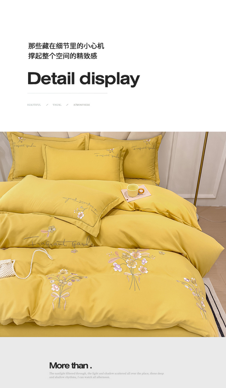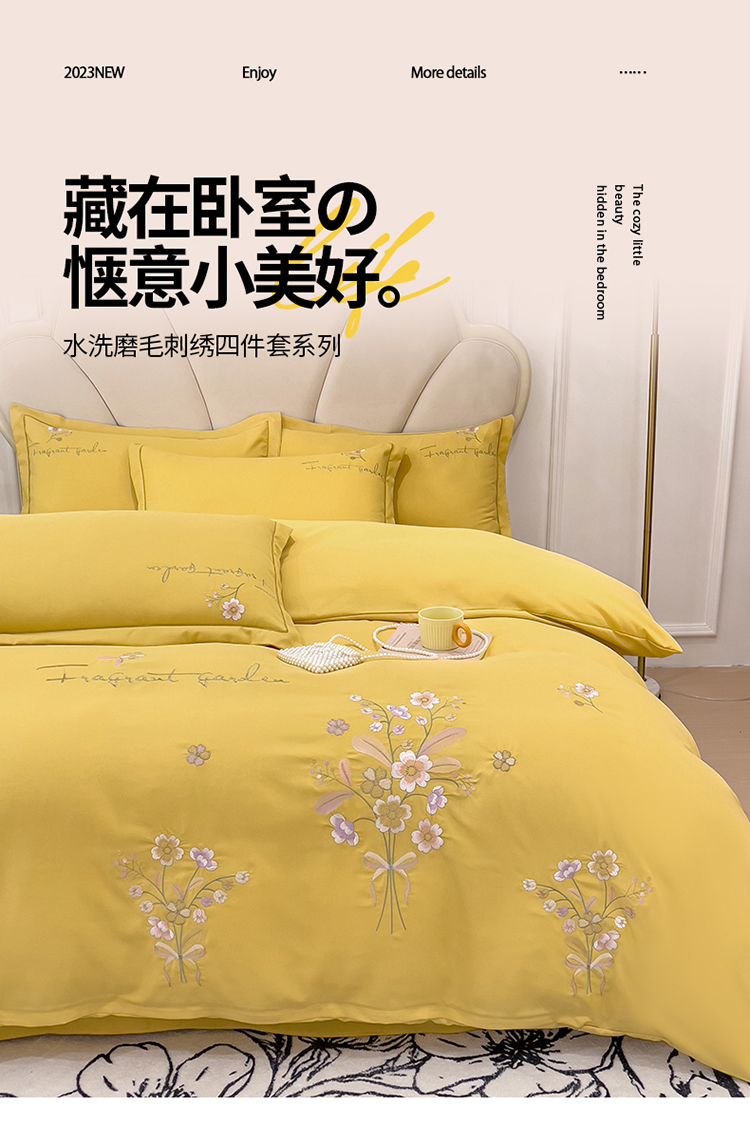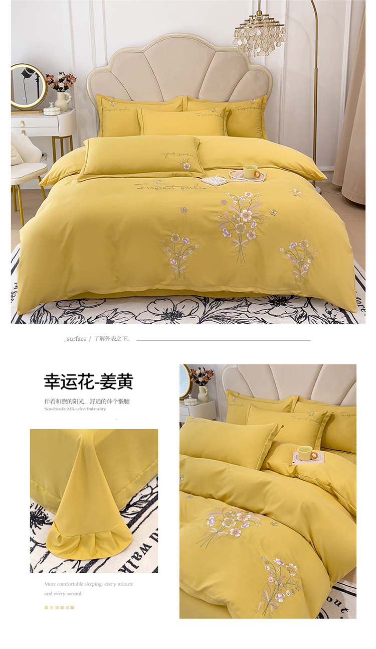 商品名称:金米诺 2024新款水洗磨毛刺绣四件套 幸运花-姜黄
