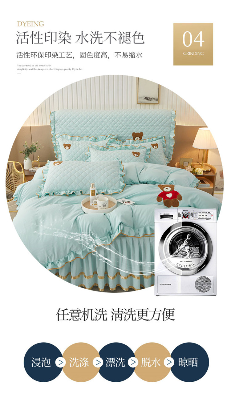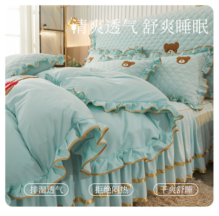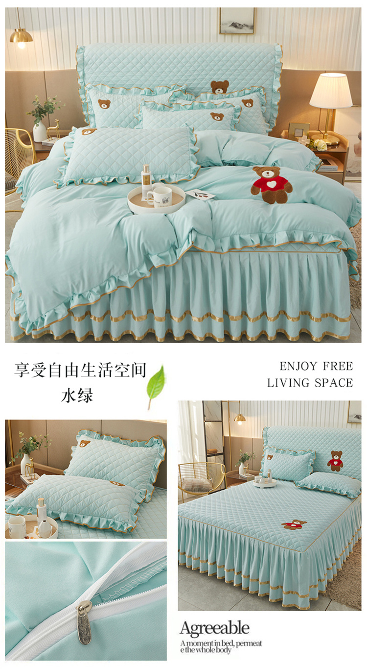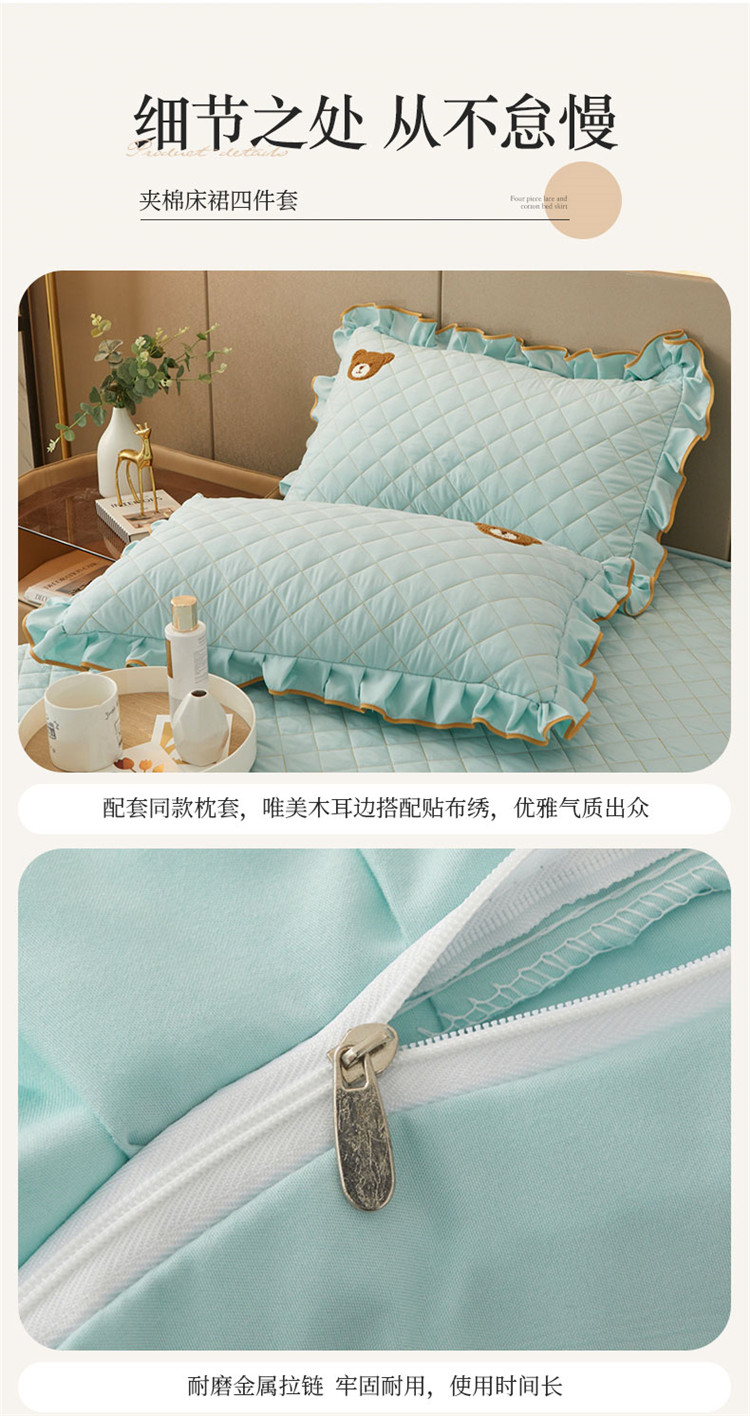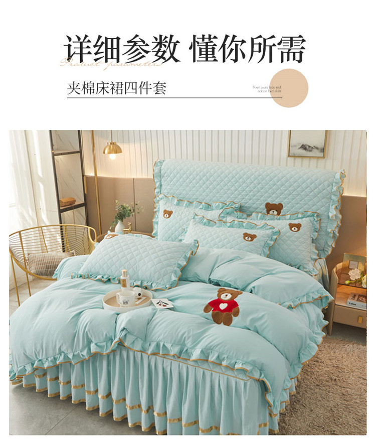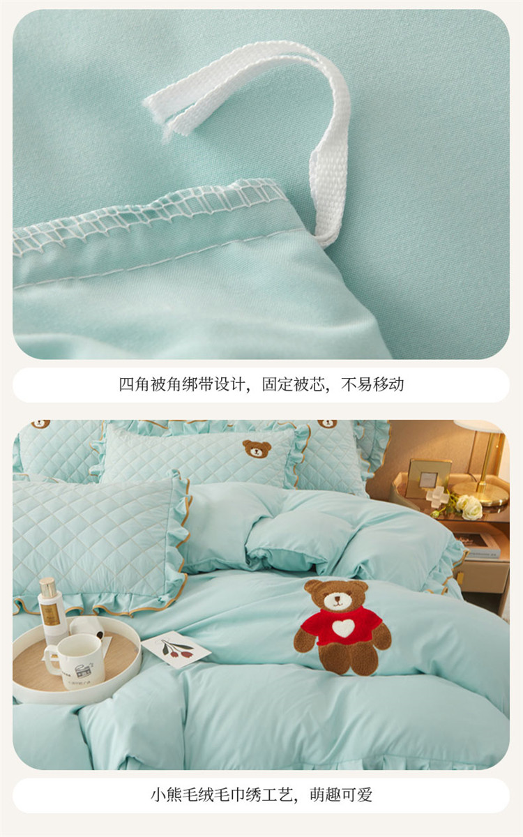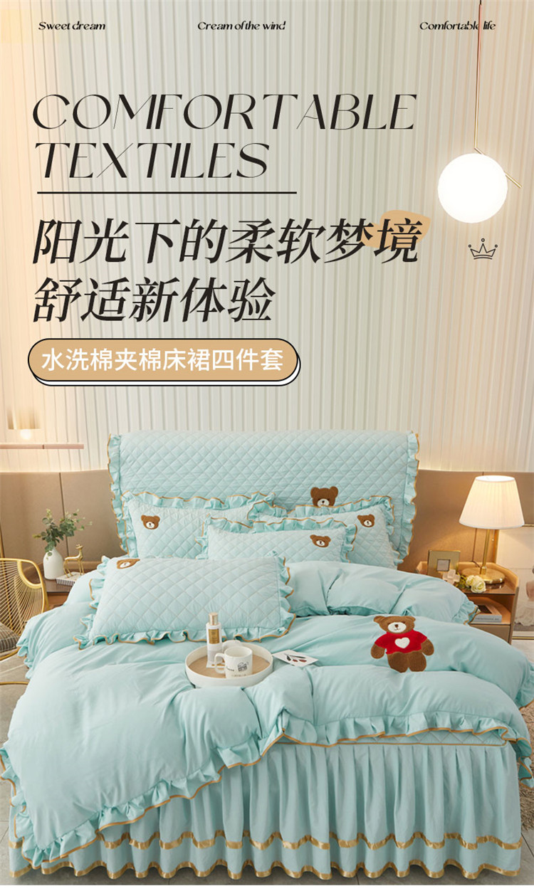 当前位置: 91家纺网 > 商品网购 > 床品套件 > 四件套 > 水洗棉四件套 > 屹成家纺 2024年水洗棉毛巾绣款床裙四件套 水绿
