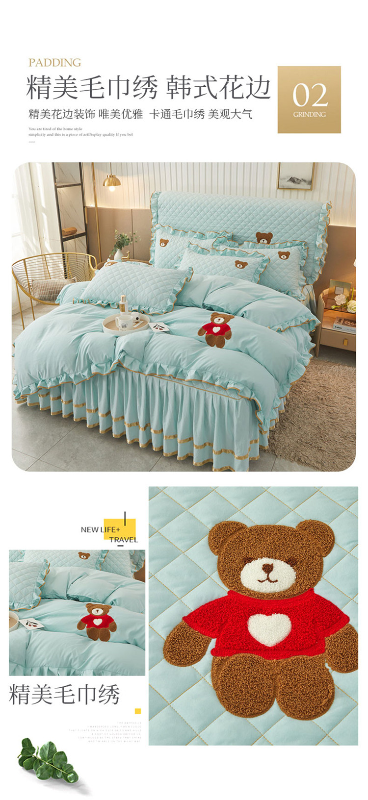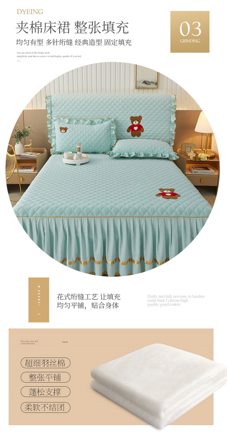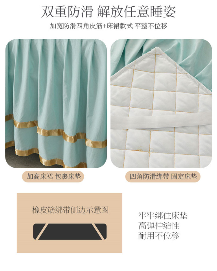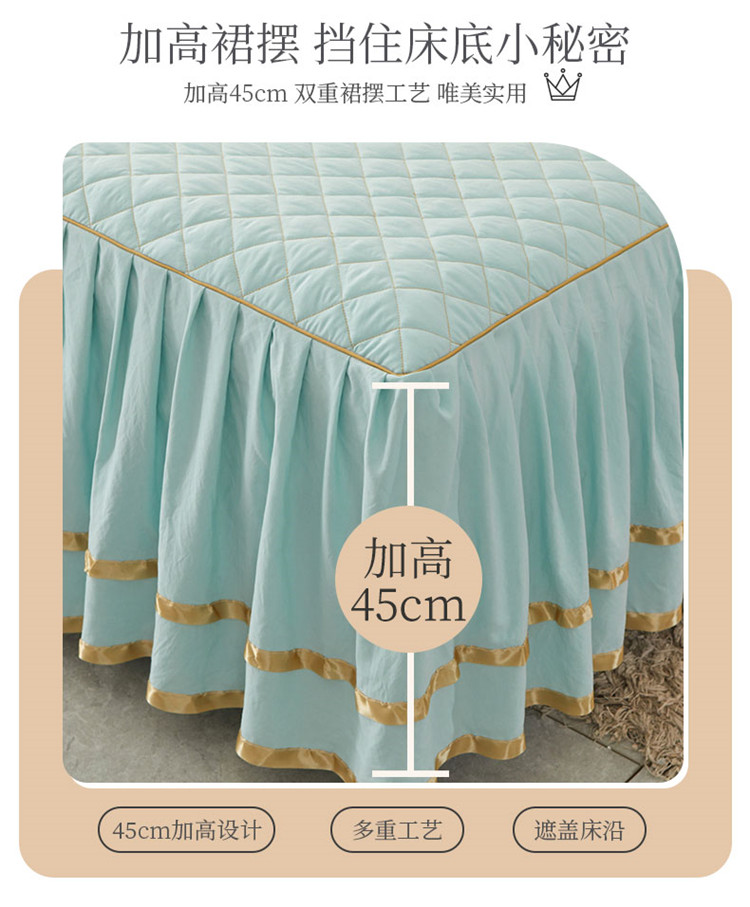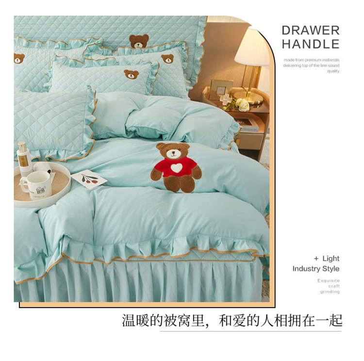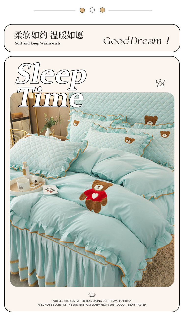 当前位置: 91家纺网 > 商品网购 > 床品套件 > 四件套 > 水洗棉四件套 > 屹成家纺 2024年水洗棉毛巾绣款床裙四件套 水绿
