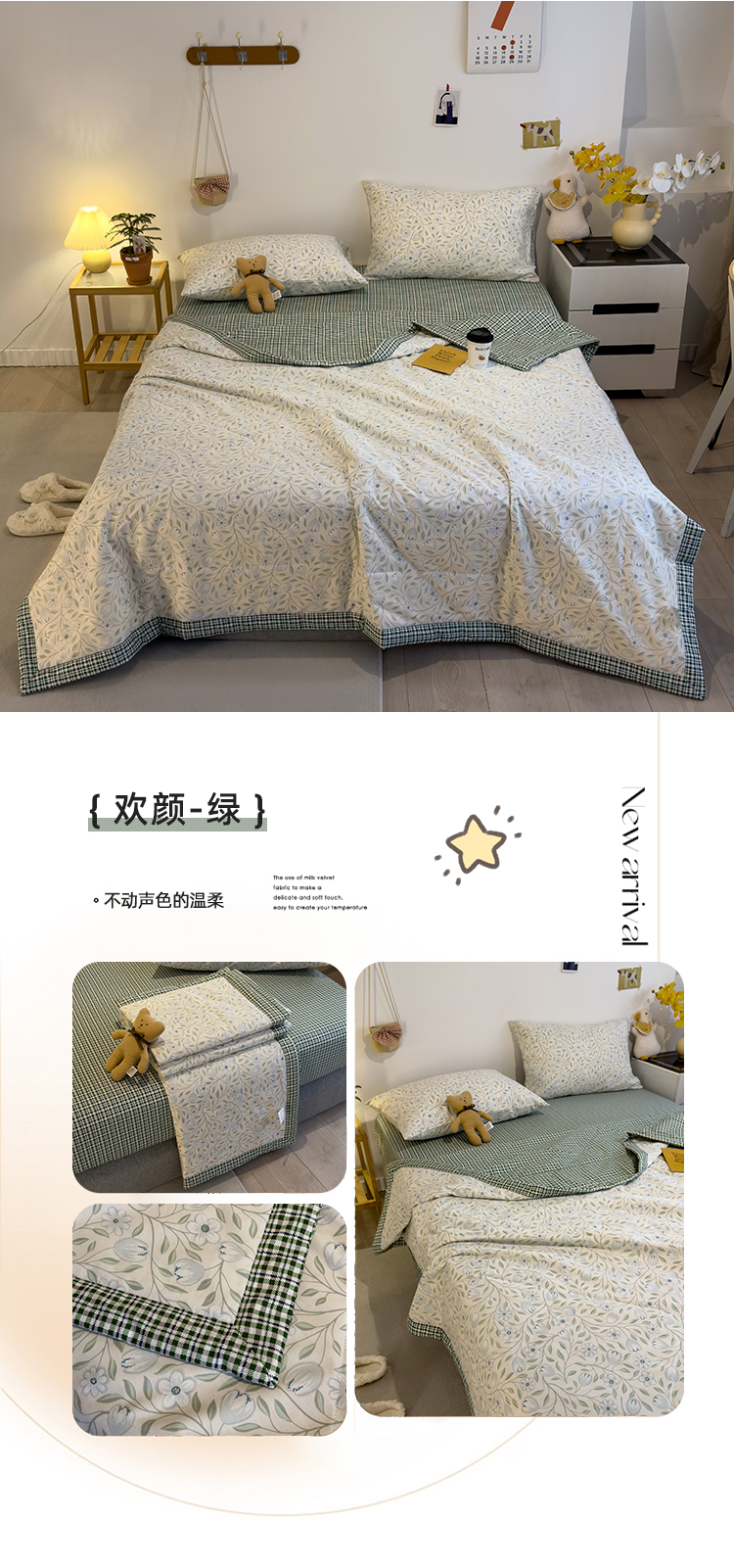 商品名称:怡家居 2023新款全棉小清新手包边夏被四件套 欢颜-绿