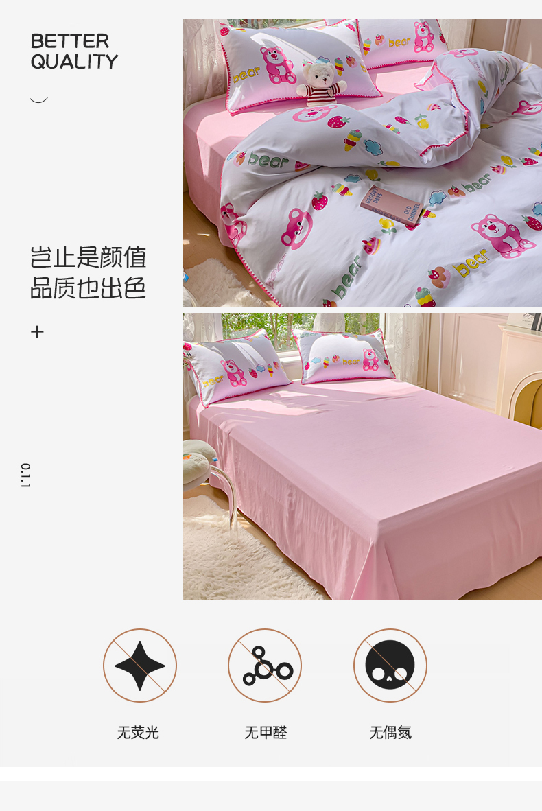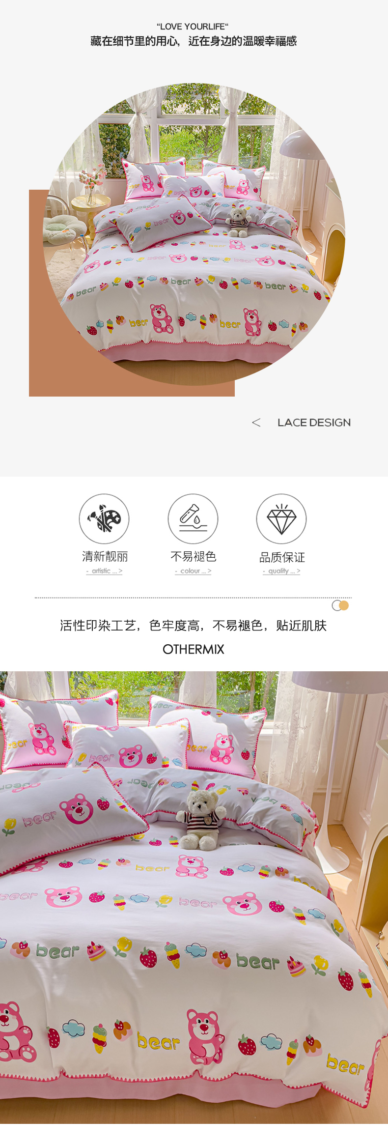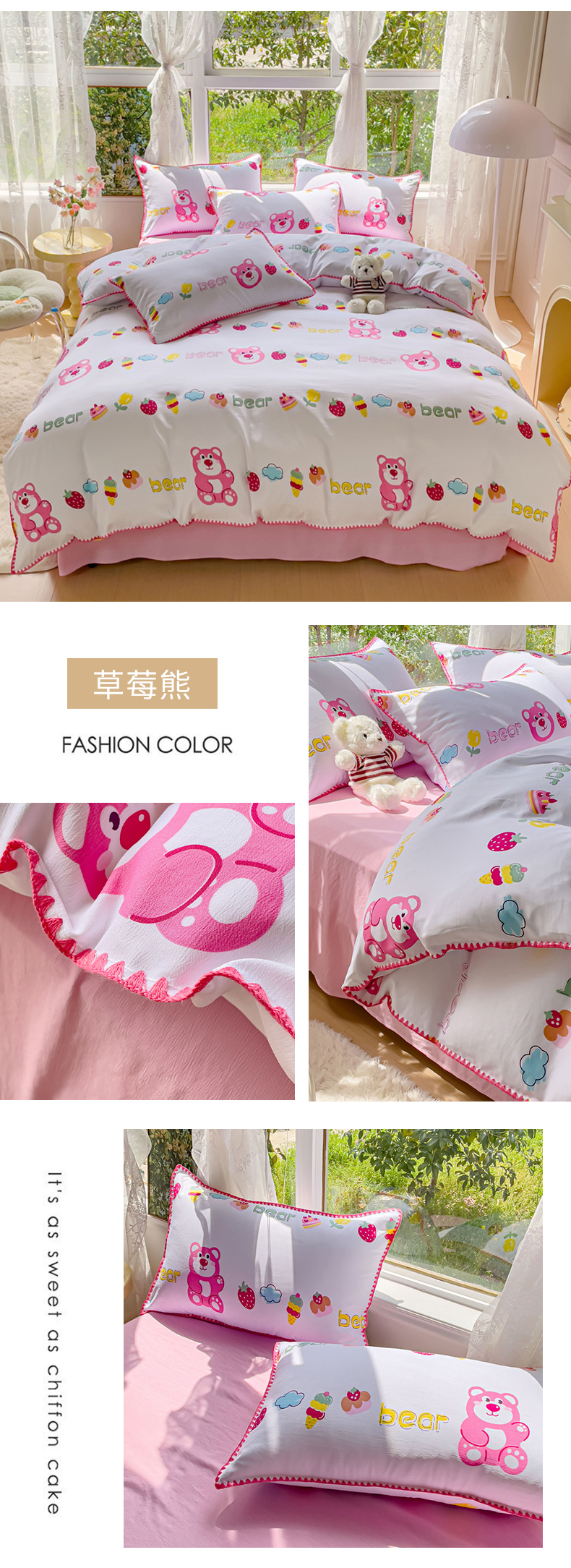 当前位置: 91家纺网 > 商品网购 > 床品套件 > 四件套 > 全棉普通四件套 > 乐居坊 2023第二批新款印花水洗双层纱贝壳绣四件套 草莓熊