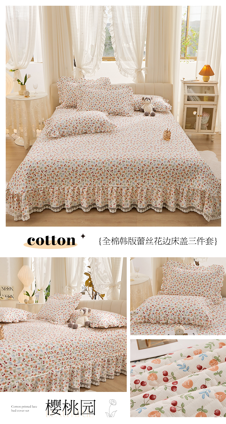 • 91家纺网 家纺一手货源 找家纺 宜凡 2023新款全棉韩版蕾丝花边床盖三件套系列 樱桃园