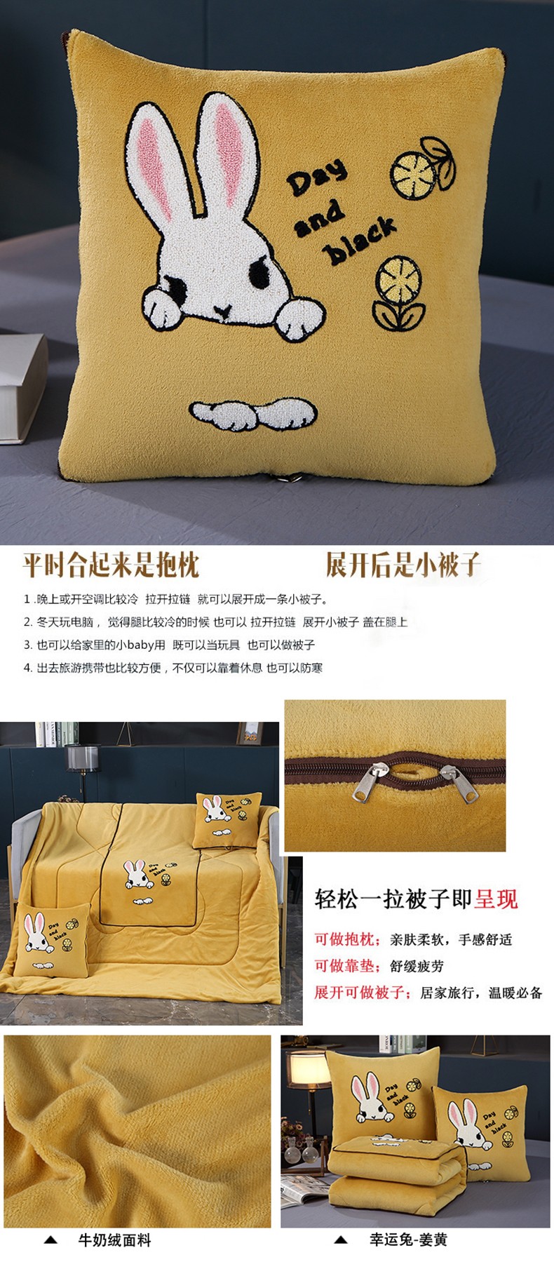商品名称:伊可爱抱枕被 2023新款牛奶绒绣花抱枕被 幸运兔-姜黄