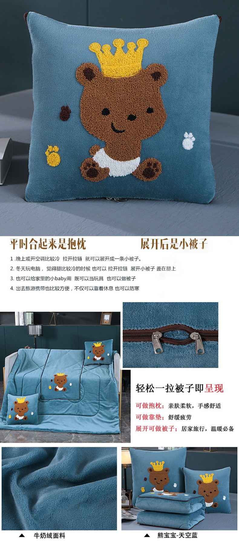 商品名称:伊可爱抱枕被 2023新款牛奶绒绣花抱枕被 熊宝宝-天空蓝