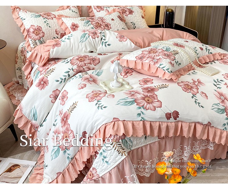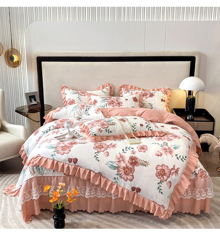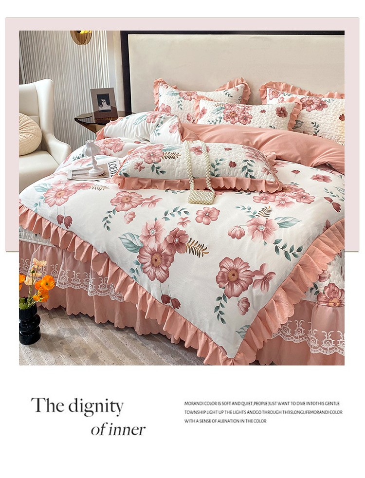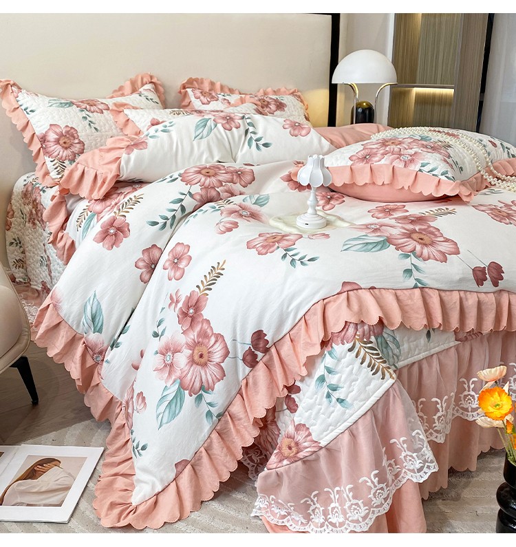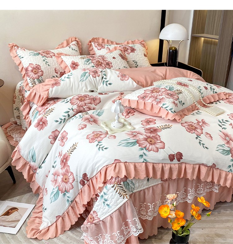 漫布云2023新款秋冬夹棉床盖韩版公主风花边床罩加厚绗绣床裙四件套