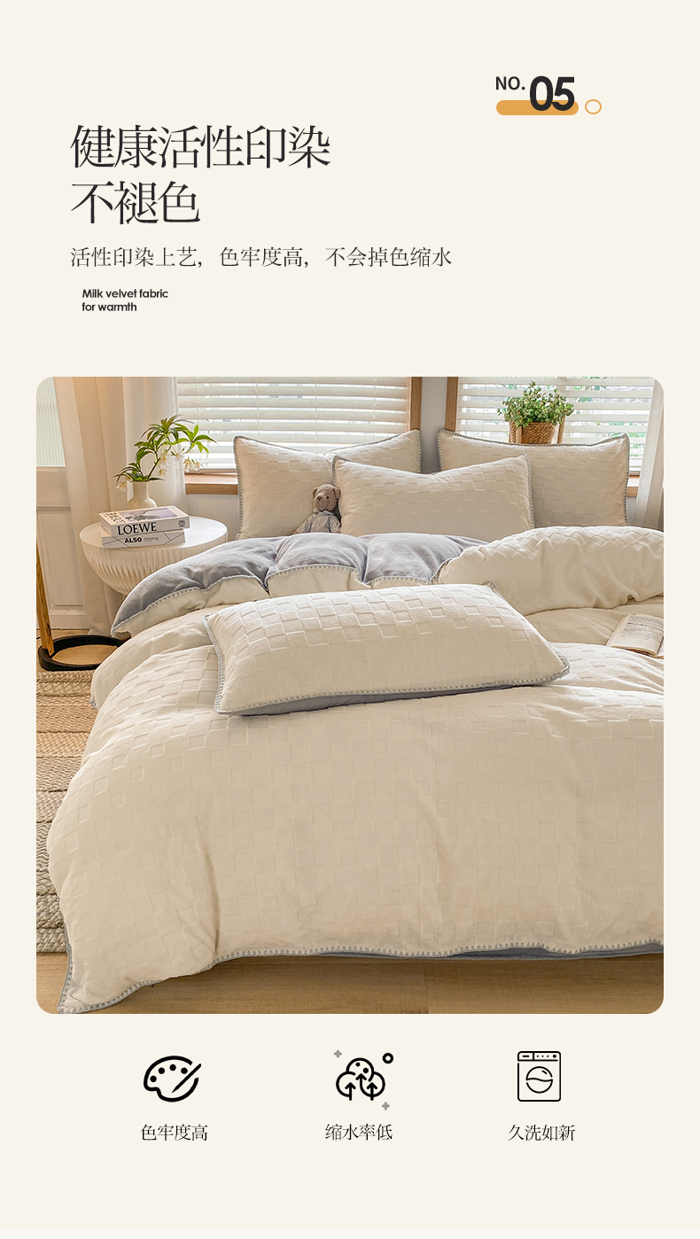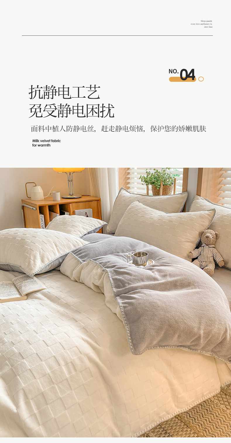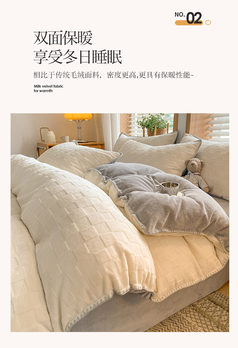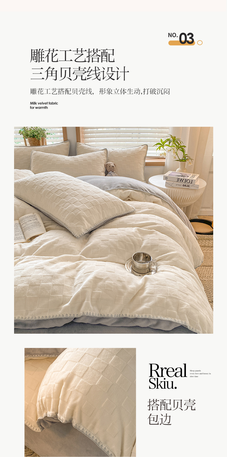 A类烂花雕花高克重加厚牛奶绒四件套三角贝壳边工艺 西尔