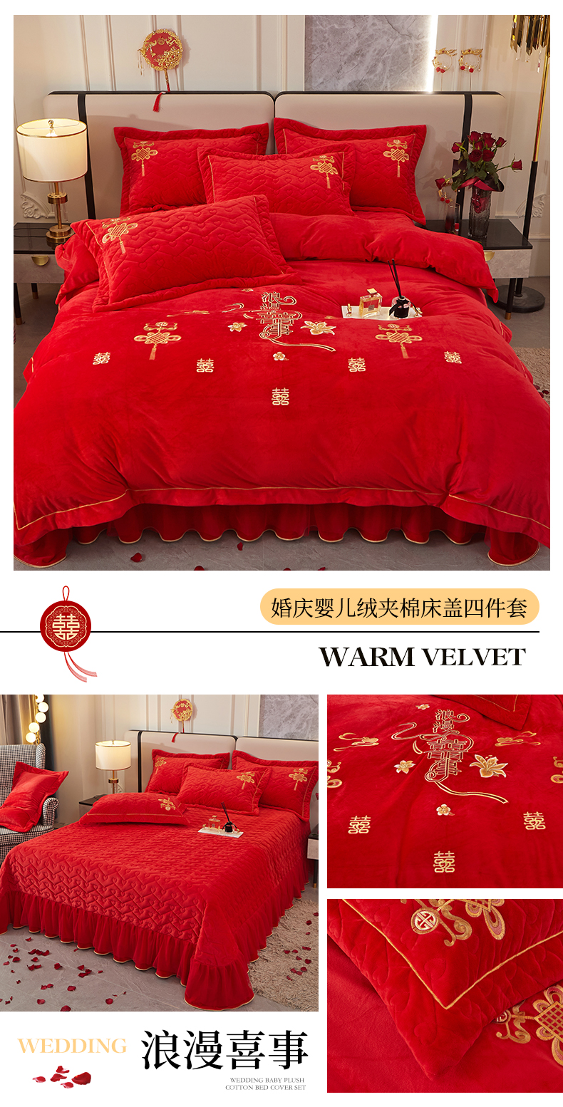 当前位置: 91家纺网 > 商品网购 > 床品套件 > 四件套 > 婚庆四件套 > 宜凡家纺 2023秋冬新品婴儿绒婚庆床盖四件套 浪漫喜事