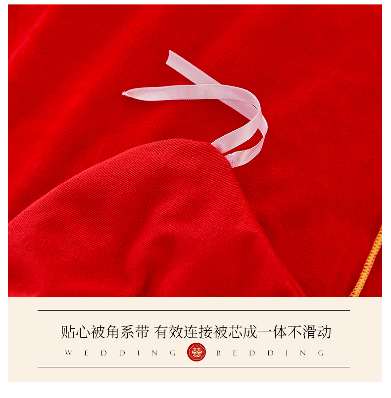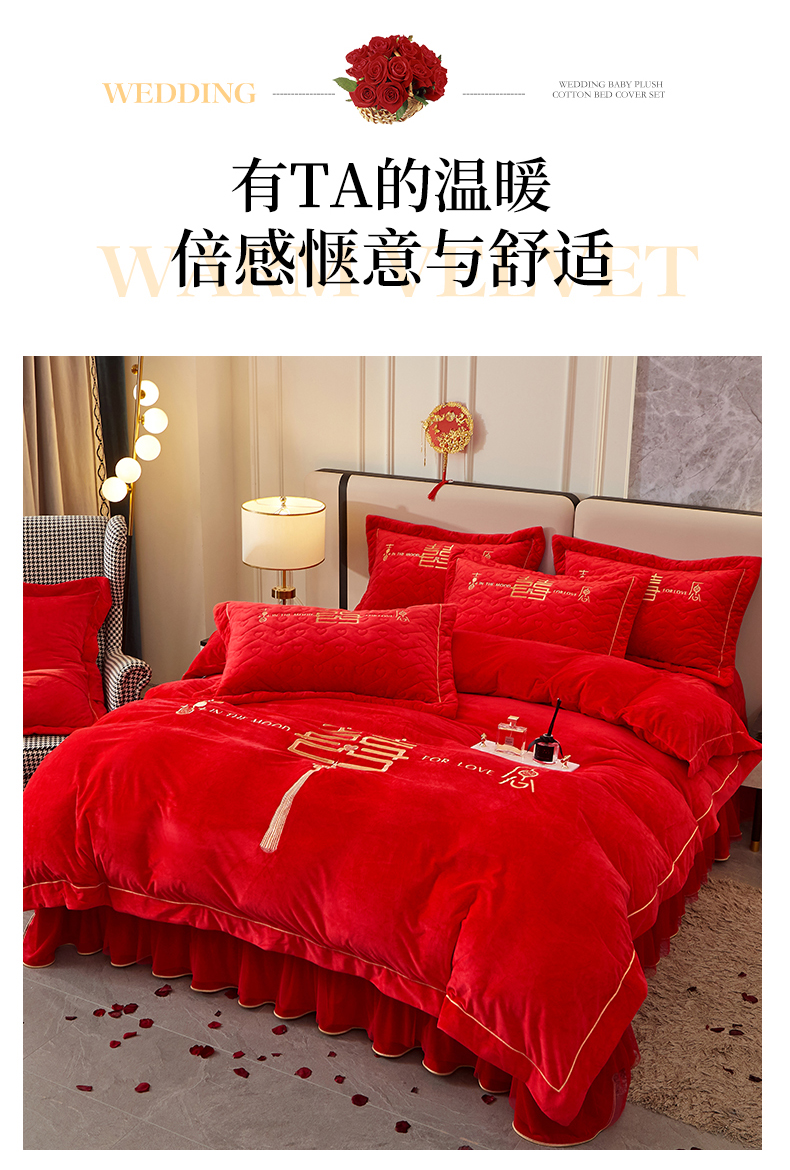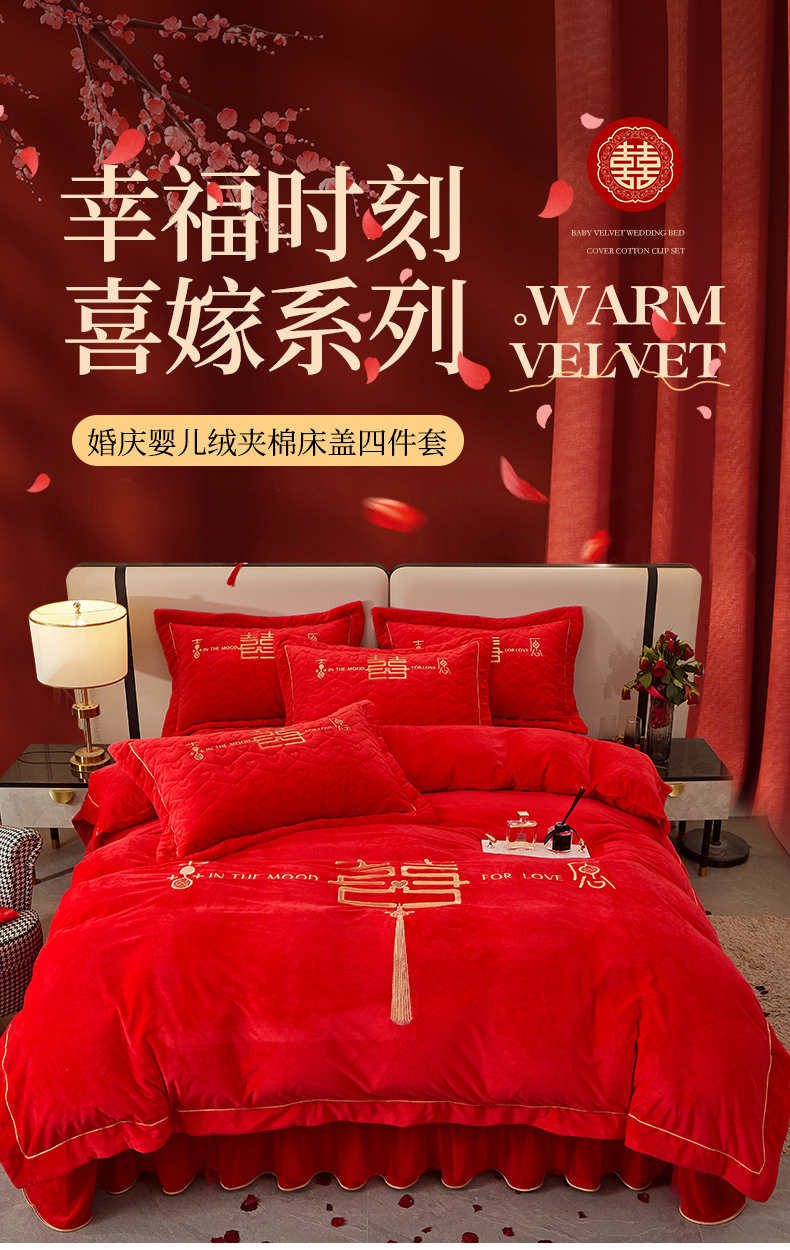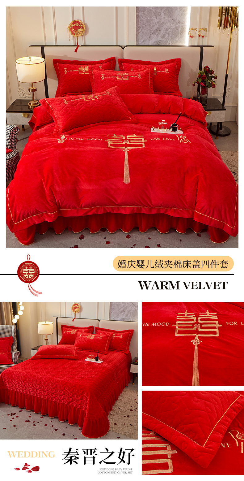 当前位置: 91家纺网 > 商品网购 > 床品套件 > 四件套 > 婚庆四件套 > 宜凡家纺 2023秋冬新品婴儿绒婚庆床盖四件套 秦晋之好