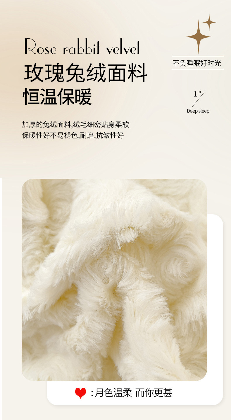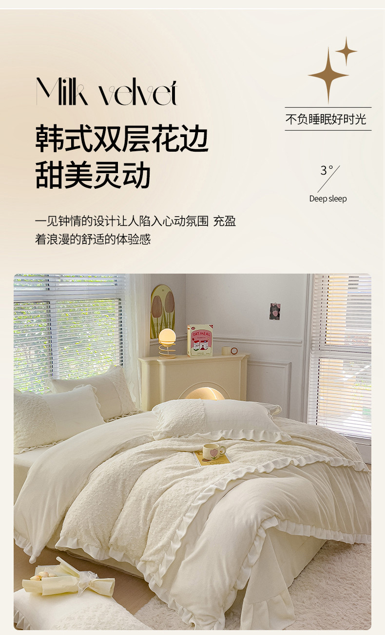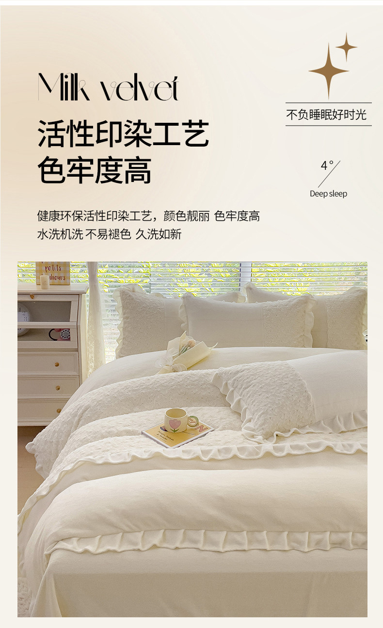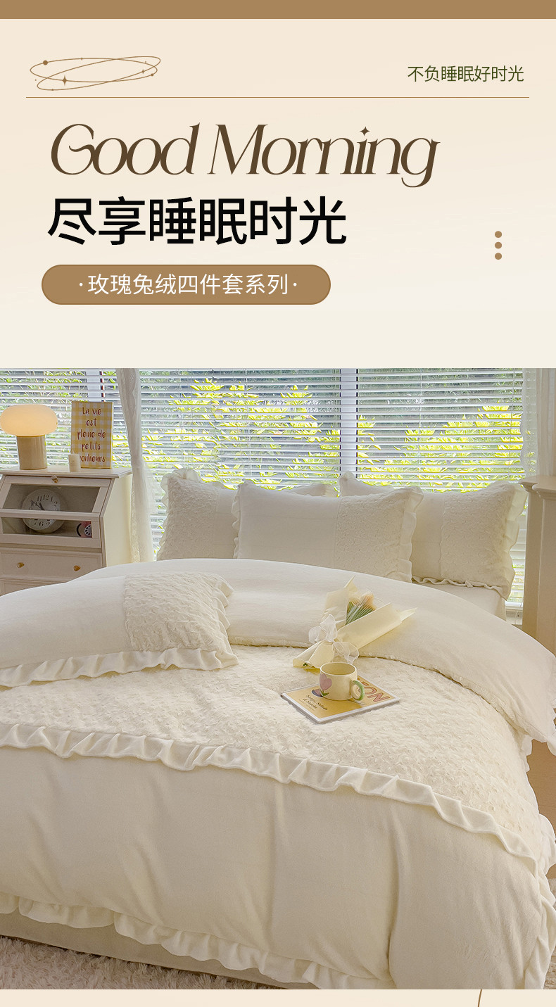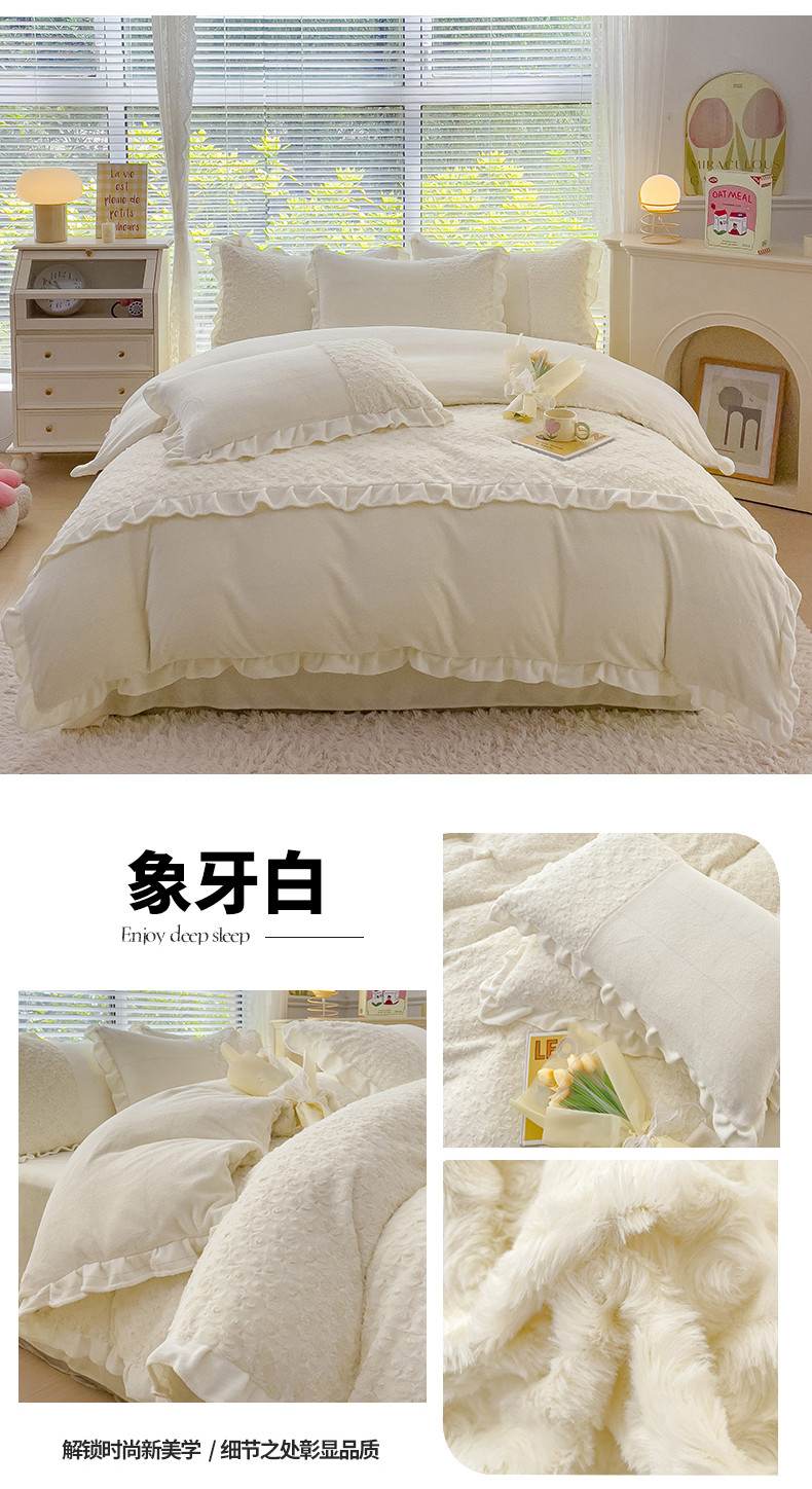 商品名称:金米诺 2024新款加厚保暖韩式双层花边玫瑰兔绒系列四件套 象牙白