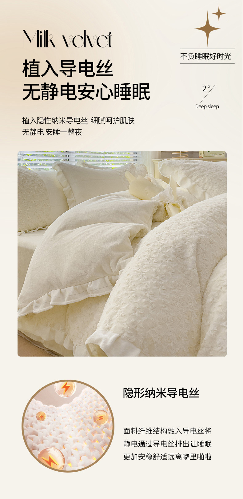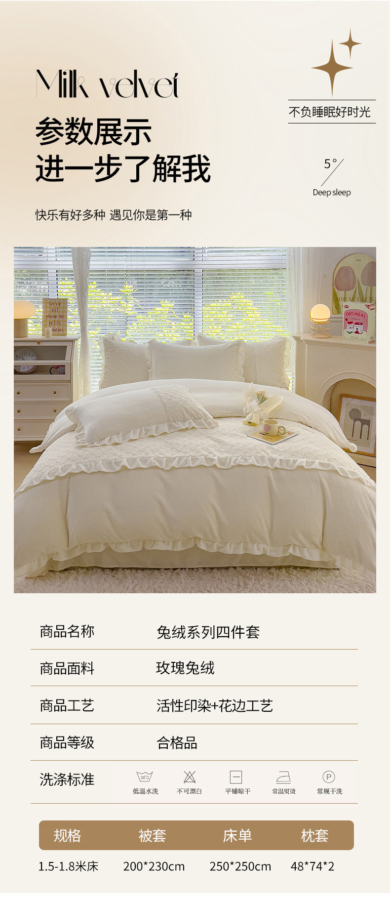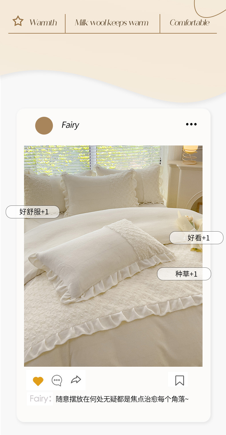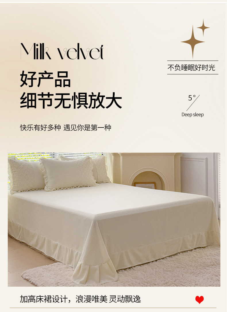 商品名称:金米诺 2024新款加厚保暖韩式双层花边玫瑰兔绒系列四件套 象牙白