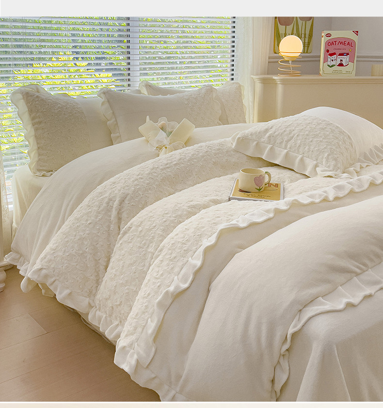 金米诺 2024新款加厚保暖韩式双层花边玫瑰兔绒系列四件套 象牙白