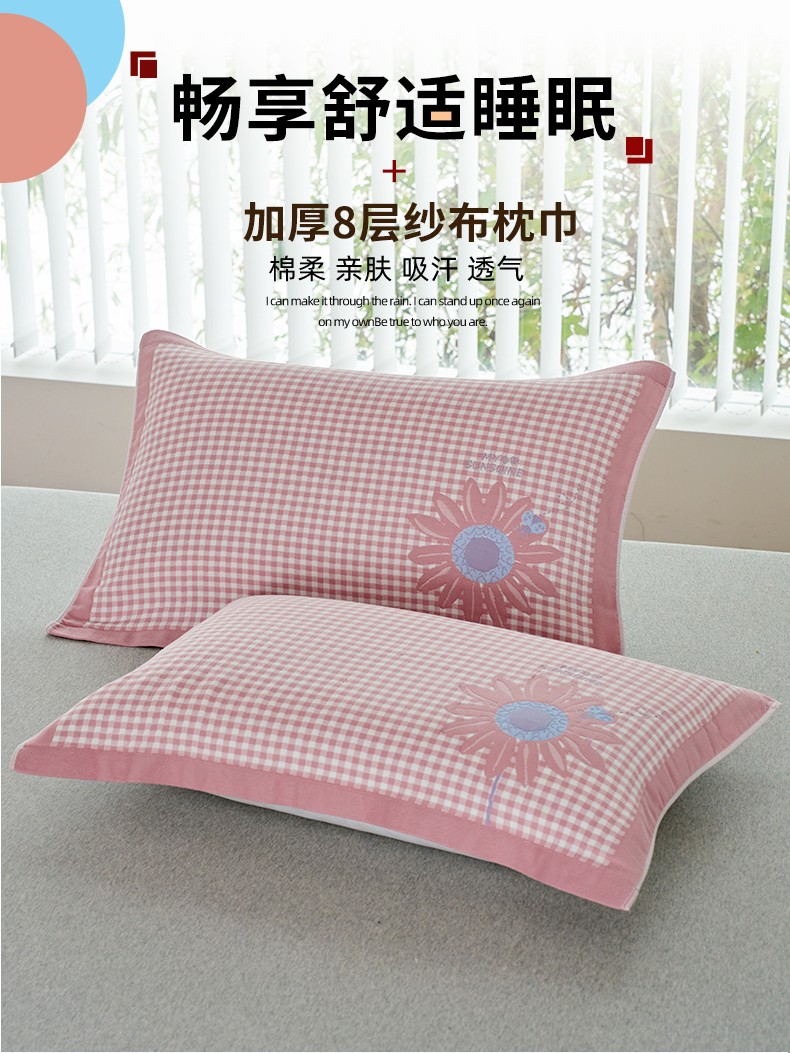 棠薇2023新款加厚八层纯棉纱布枕巾一对装小清新小格子系列全棉枕头盖巾 雏菊浅粉52*78±2cm