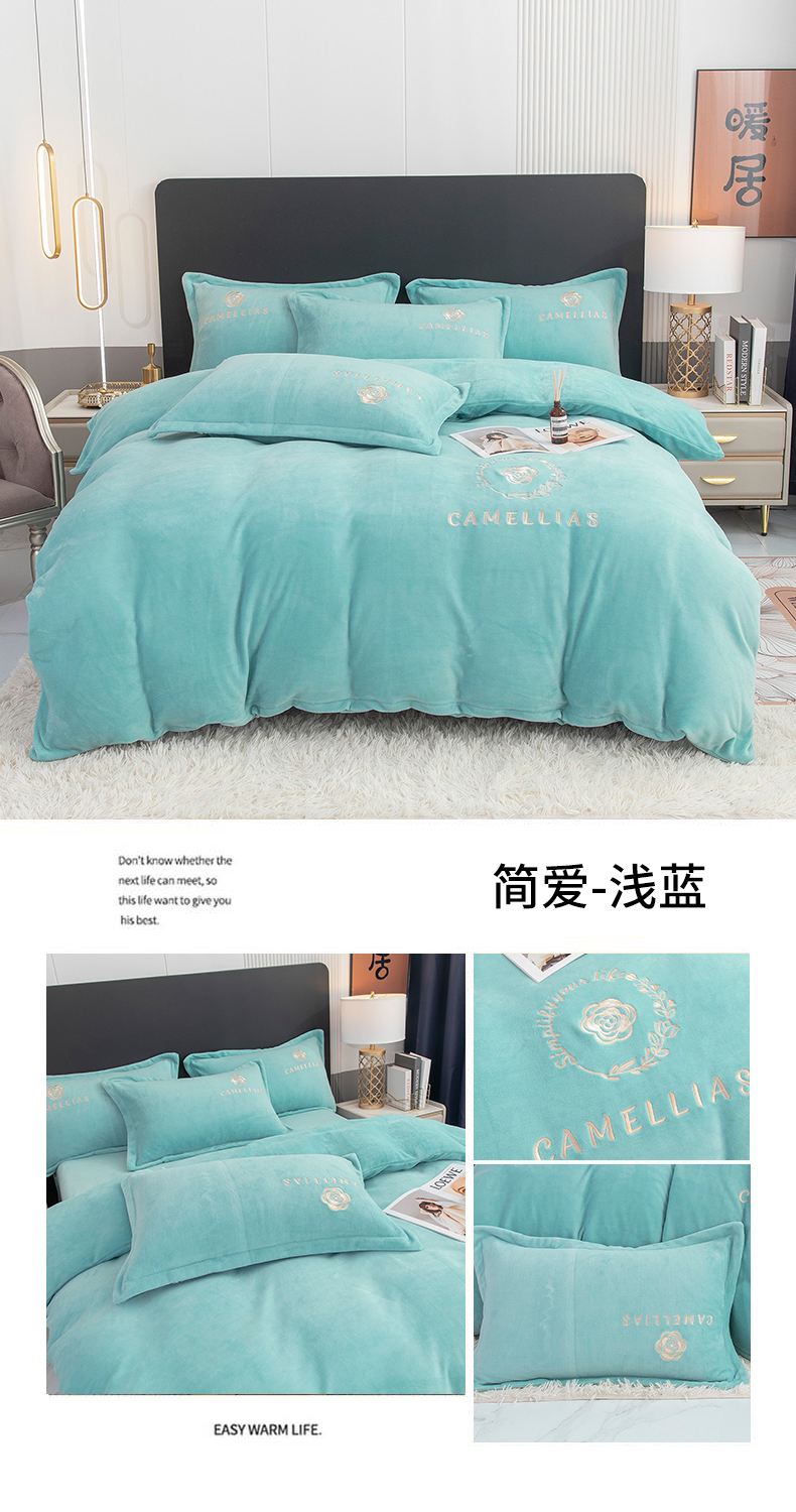 商品名称:昊翔2024新款高克重纯色牛奶绒绣花加厚保暖刺绣四件套 简爱-浅蓝