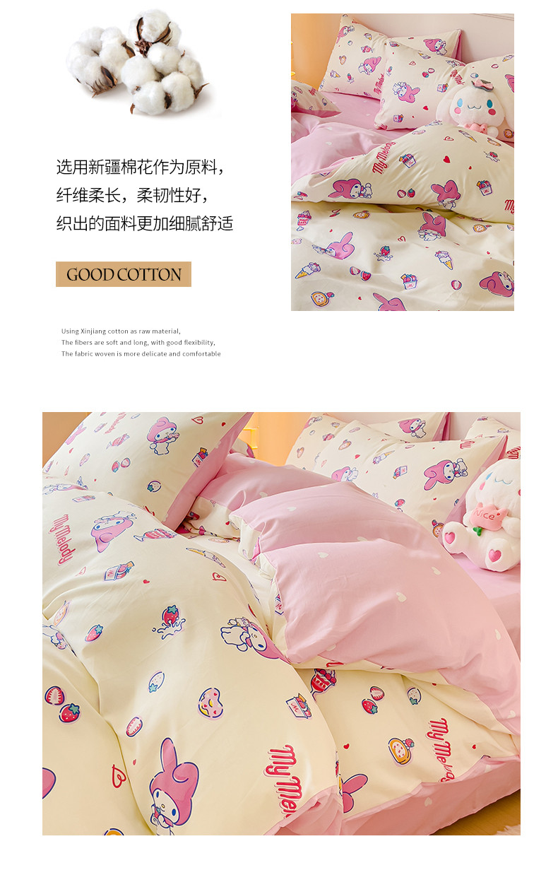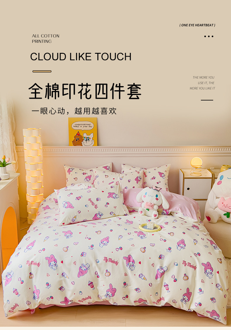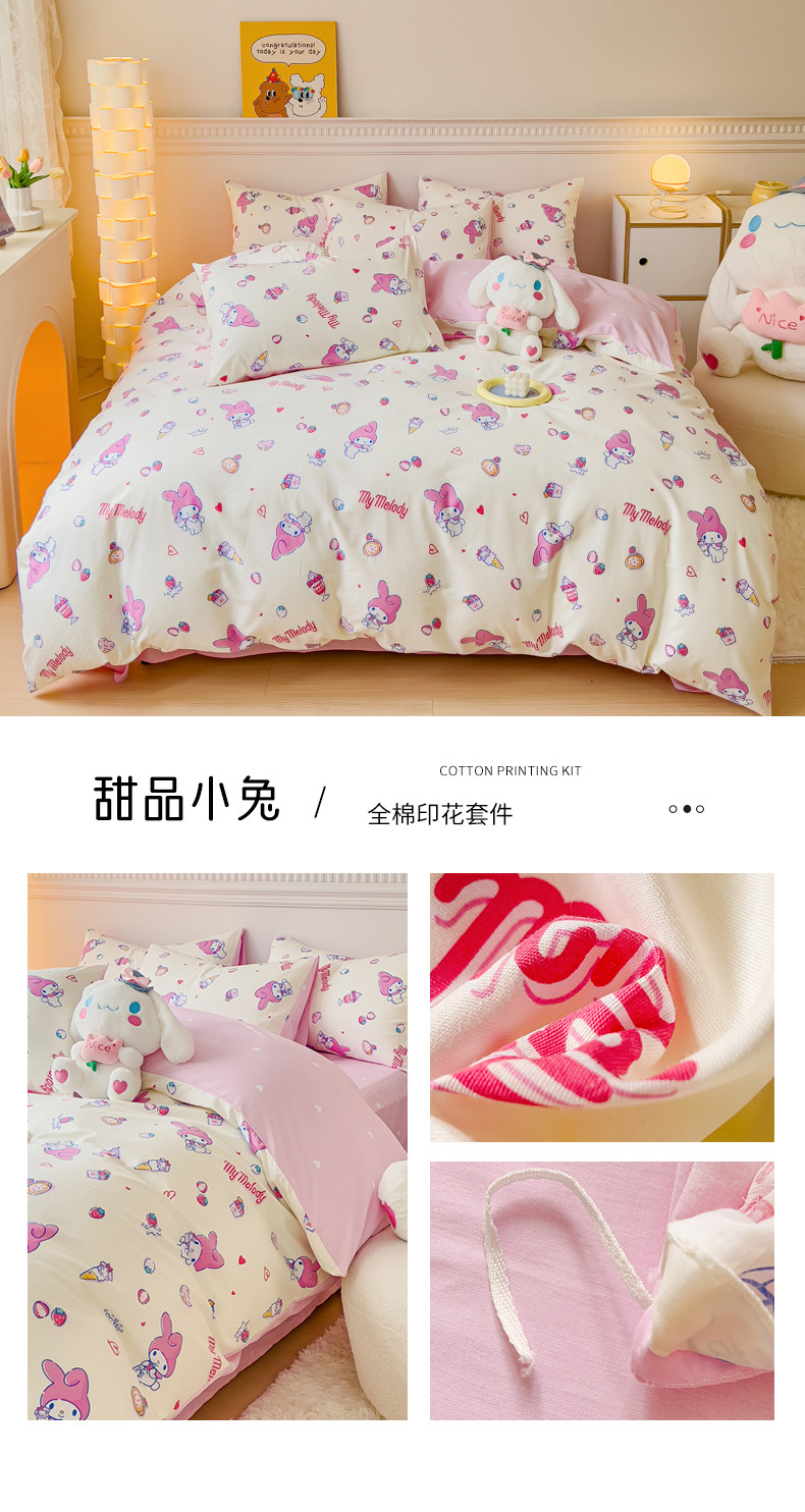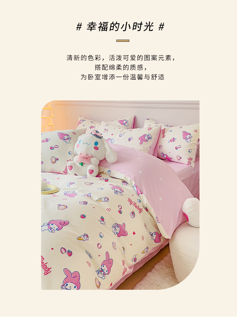 当前位置: 91家纺网 > 商品网购 > 床品套件 > 四件套 > 全棉普通四件套 > 金丝鸟家纺 2023新款全棉印花三利欧库洛米系列四件套 甜品小兔