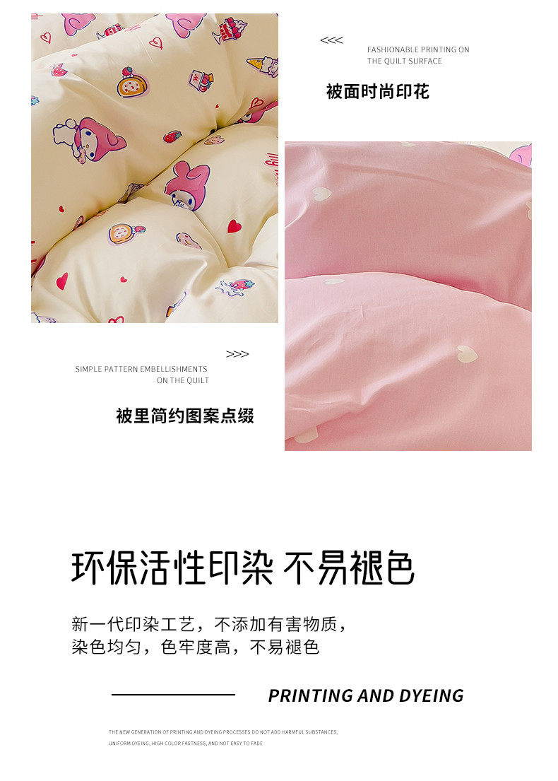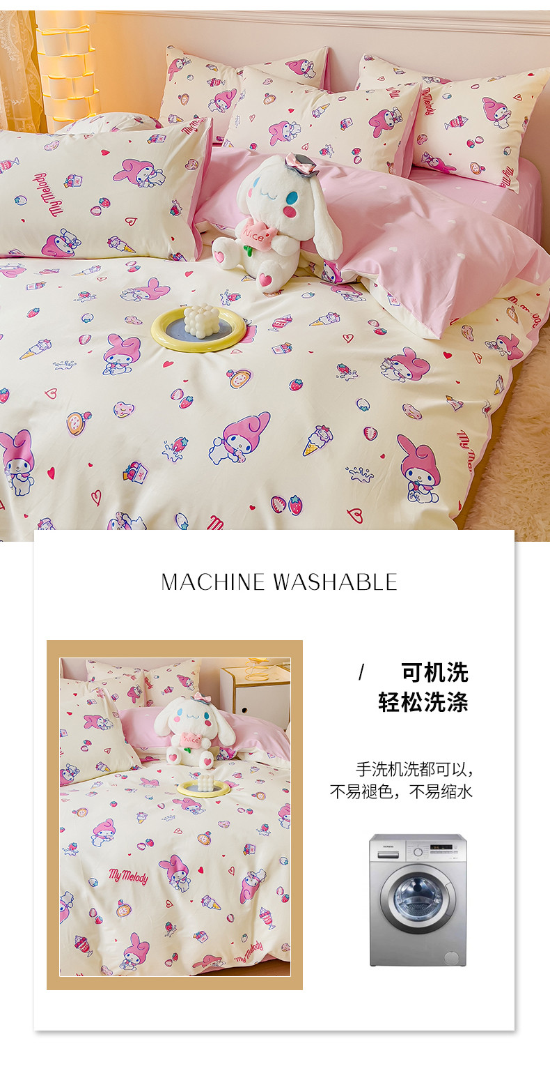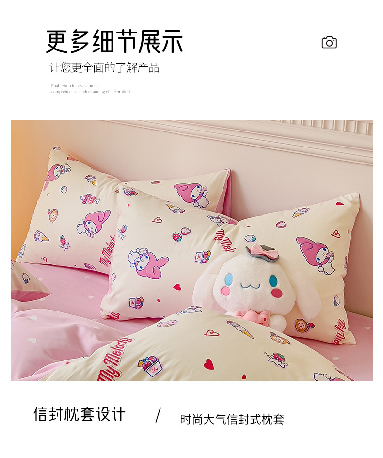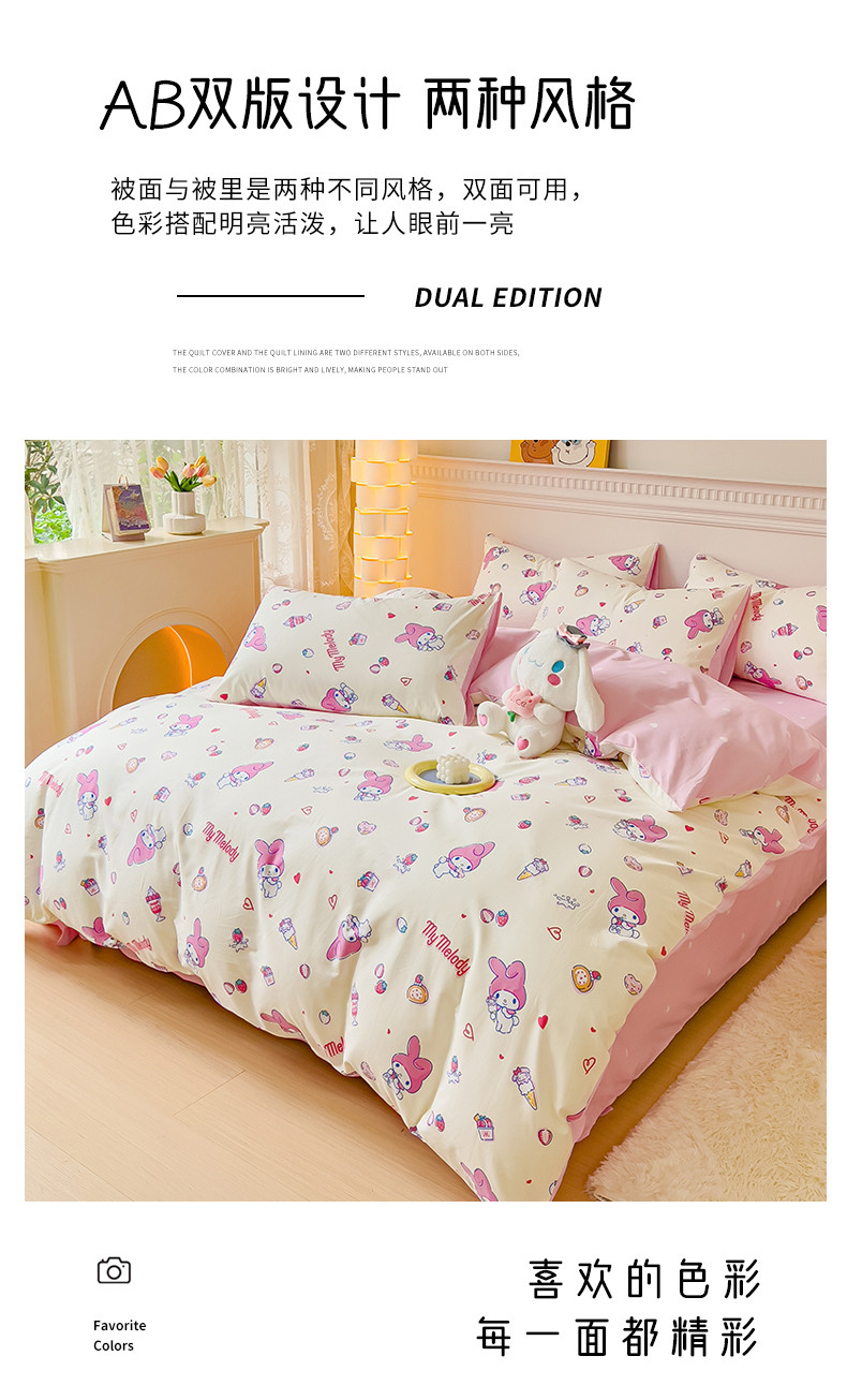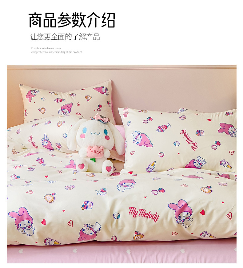当前位置: 91家纺网 > 商品网购 > 床品套件 > 四件套 > 全棉普通四件套 > 金丝鸟家纺 2023新款全棉印花三利欧库洛米系列四件套 甜品小兔
