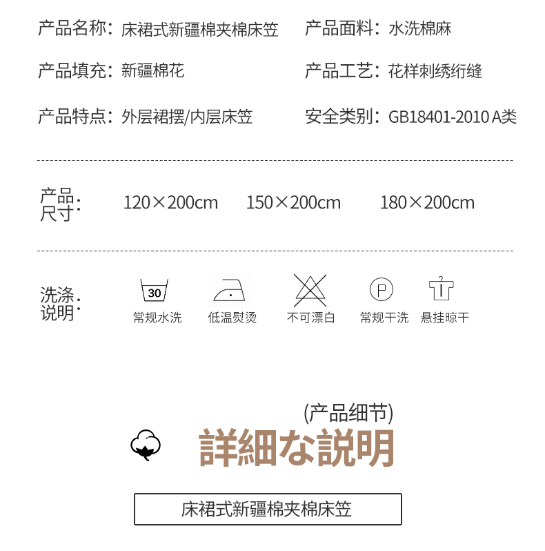 商品名称:(总)纤雅床笠 2024新款水洗棉床裙式新疆棉花床笠