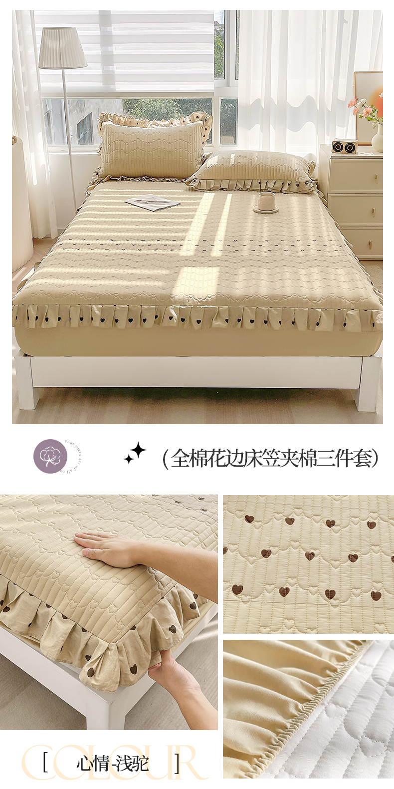 宜凡家纺 2024新品全棉夹棉花边床笠三件套-心情 心情 浅驼