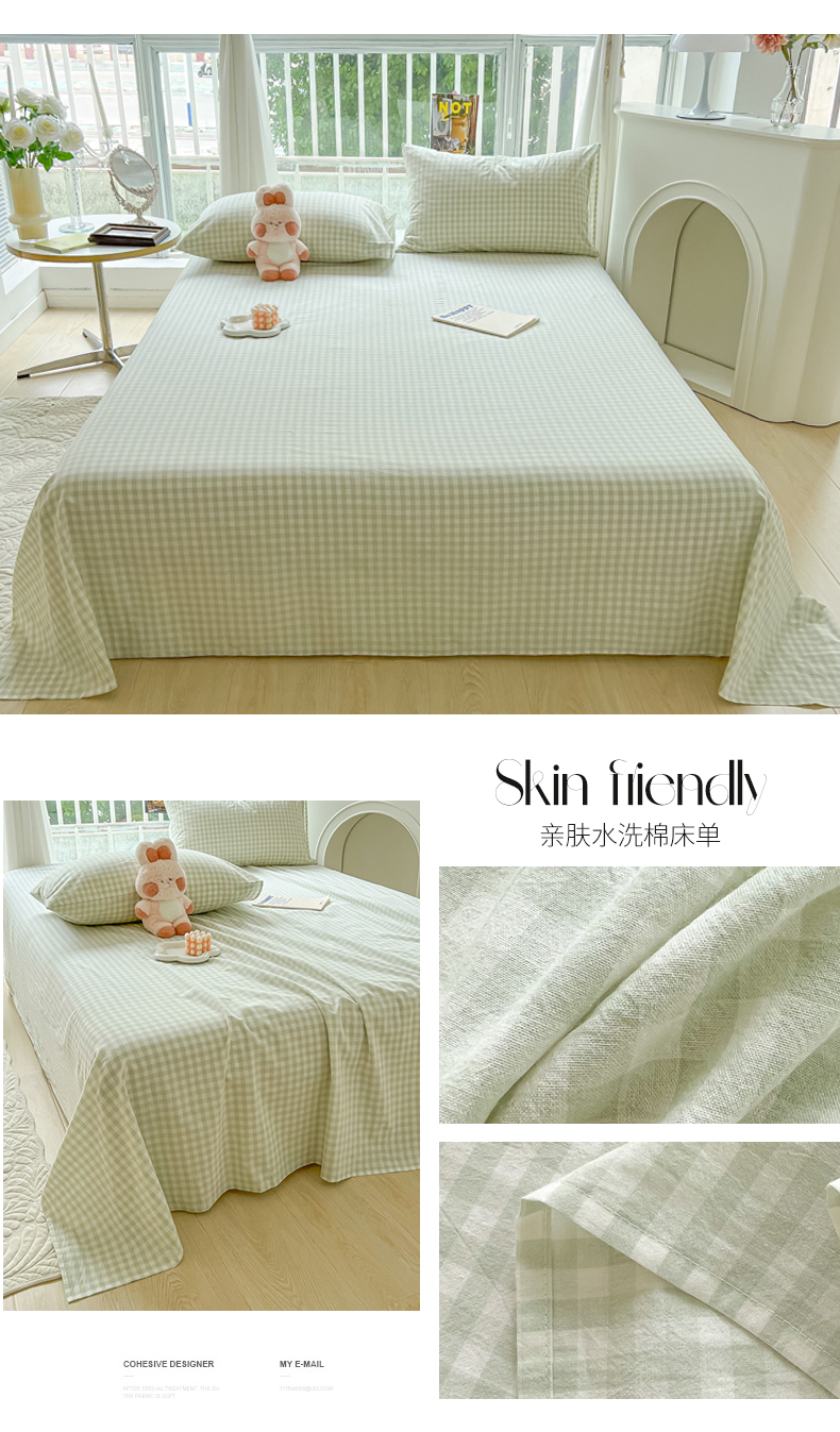 盼季家纺 2024新款简约格子纯色水洗棉床单单件宿舍被单三件套 浅绿格