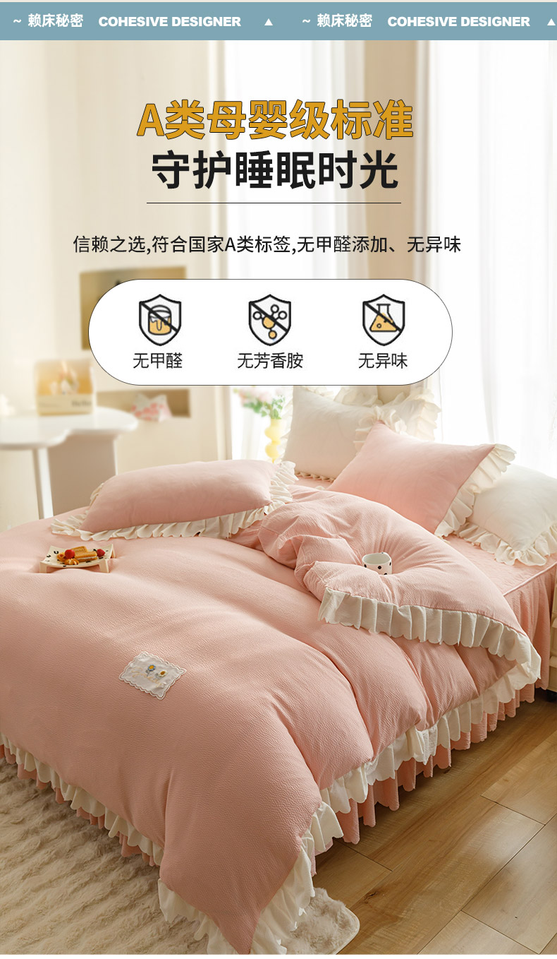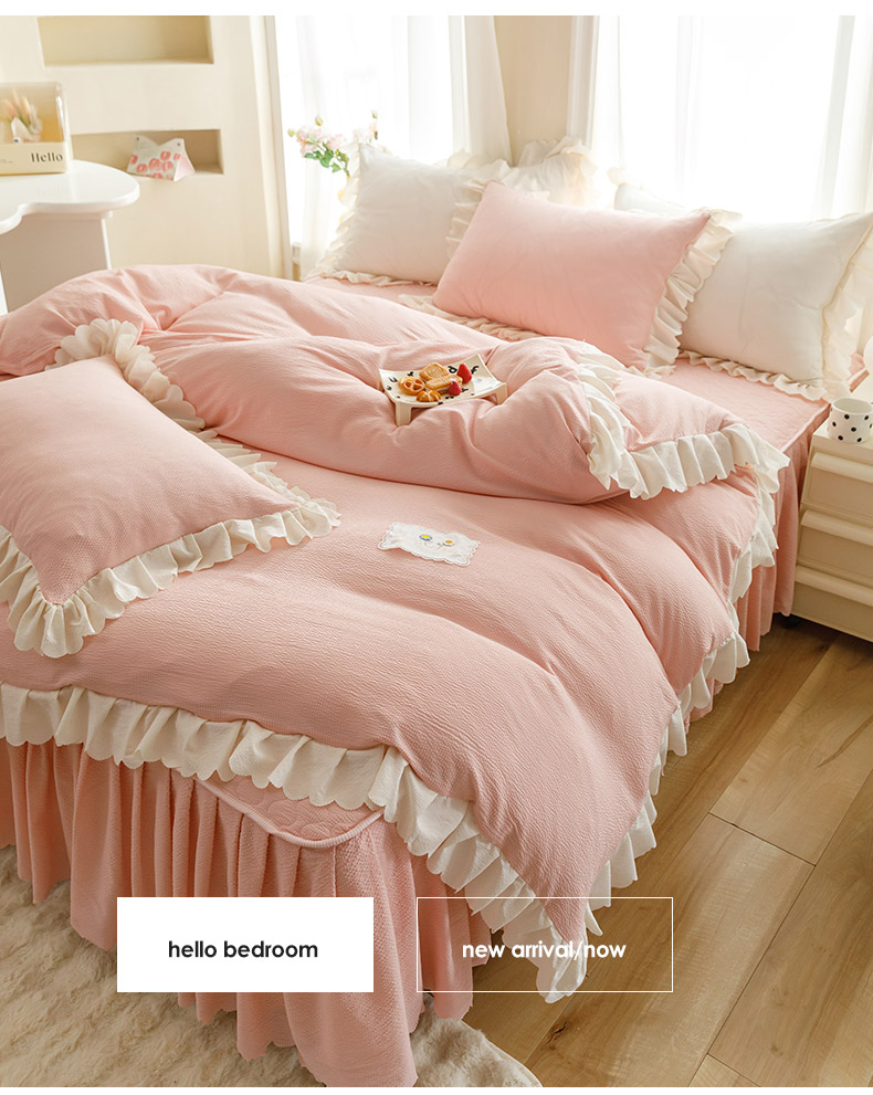 当前位置: 91家纺网 > 商品网购 > 床品套件 > 四件套 > 全棉普通四件套 > 欧冠家纺 2024新款四季款夹棉泡泡纱床裙床笠被套四件套 玉色