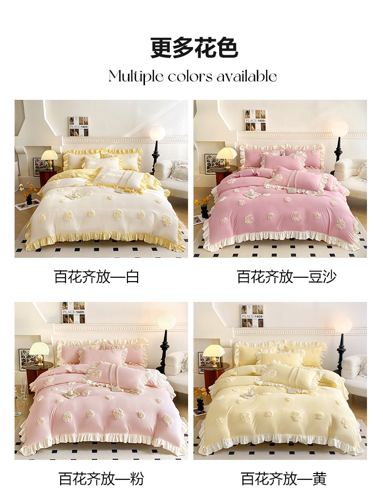 (总)富盛家纺 2024新款水洗亲肤棉立体盘花刺绣四件套公主风四件套,百花齐放-紫,百花齐放-嫩绿,百花齐放-粉,百花齐放-浅绿,百花齐放-黄,百花齐放-白,百花齐放-蓝,百花齐放-豆沙