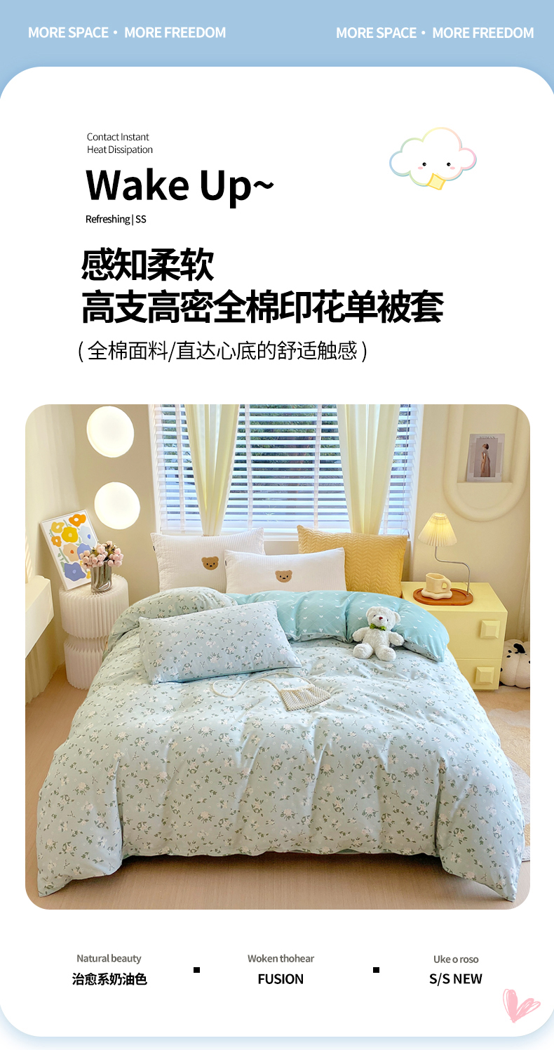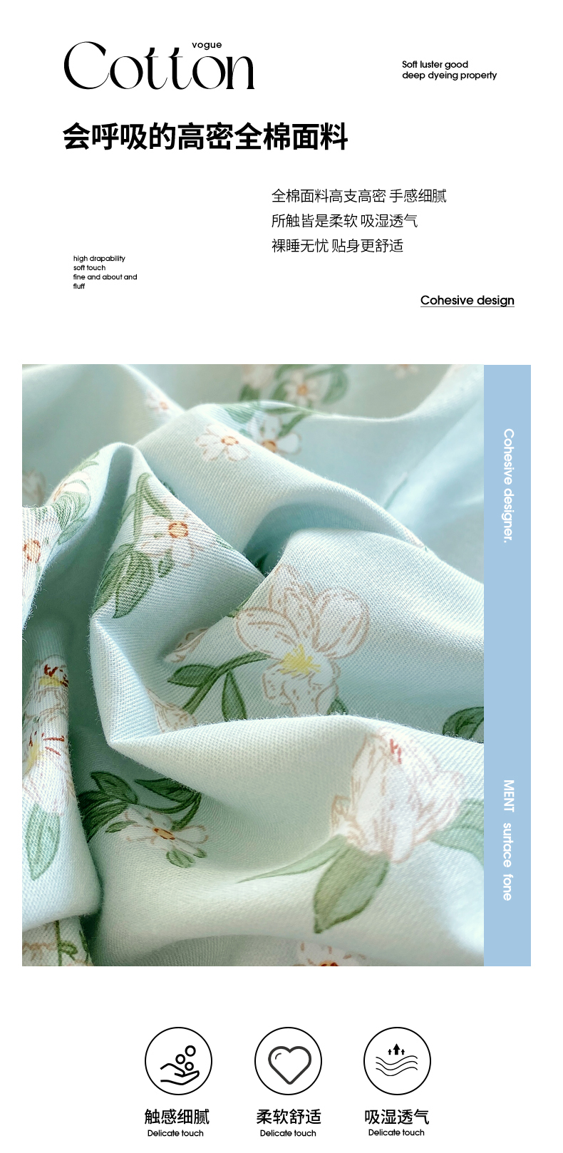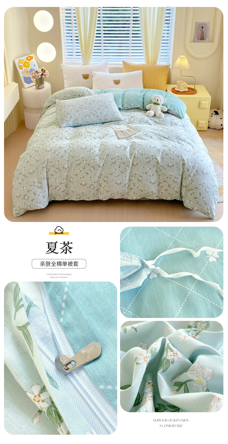 商品名称:洺兰 2025年全棉喷气印花四件套纯棉床单床笠款小清新花卉北欧风--单被套 夏茶