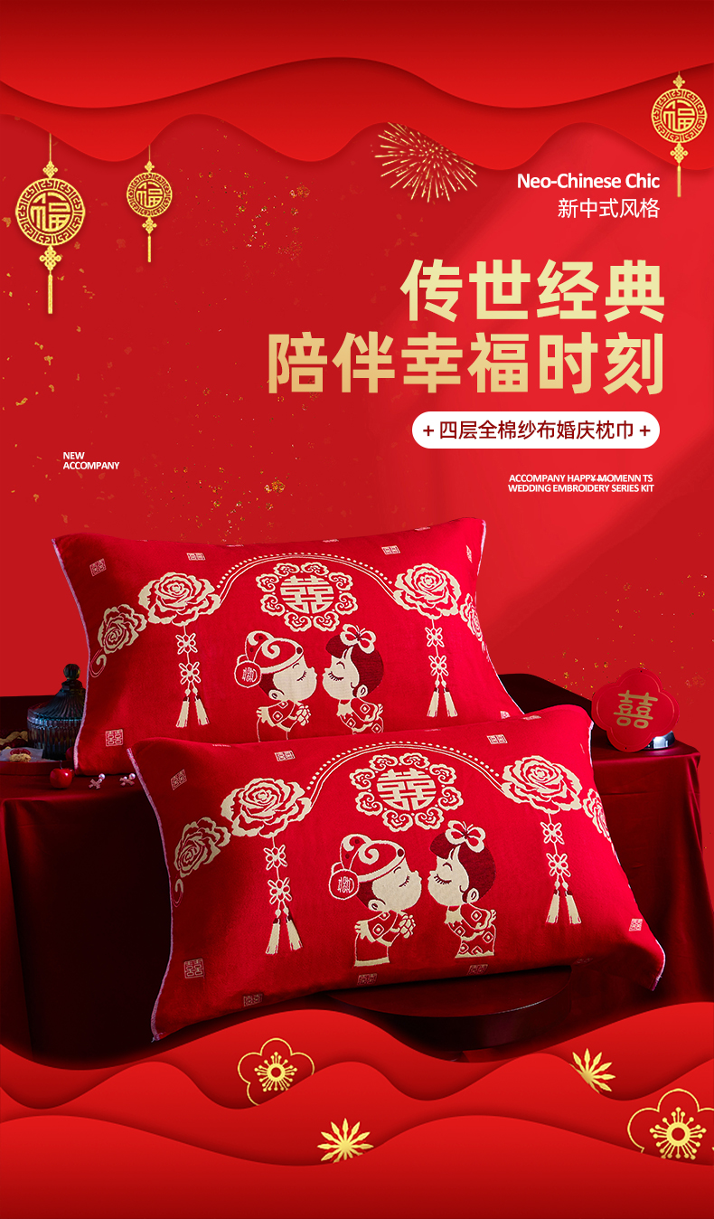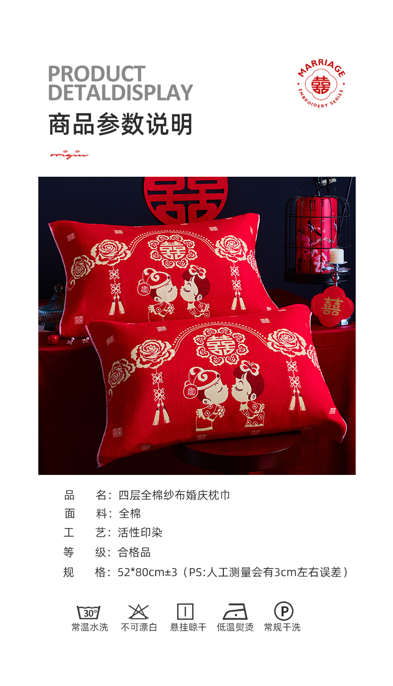 (总)美宜家 2025新款四层全棉纱布婚庆枕巾枕套枕头,百年好合,吉祥如意,喜上眉梢,喜气洋洋,喜结良缘,喜结连理,心心相印,欢欢喜喜,浪漫爱情,双喜临门,真爱永恒,花好月圆