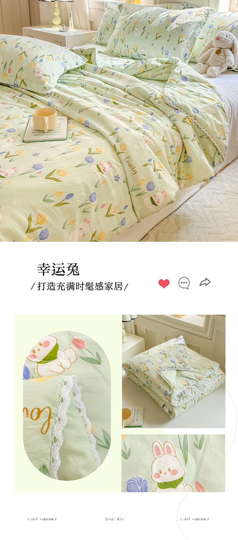 • 91家纺网 家纺一手货源 找家纺 创优家纺  2025新款A类皱皱纱小花边夏被 幸运兔