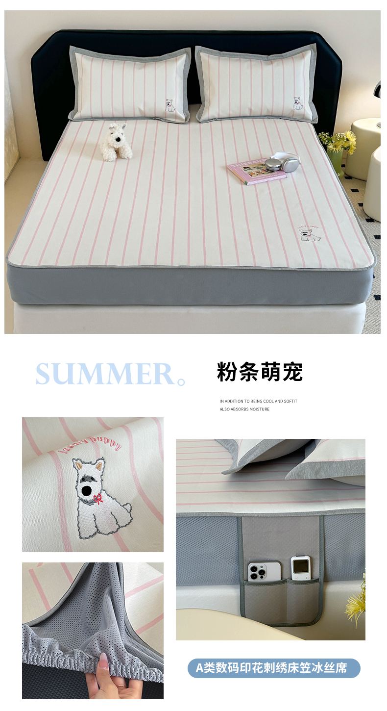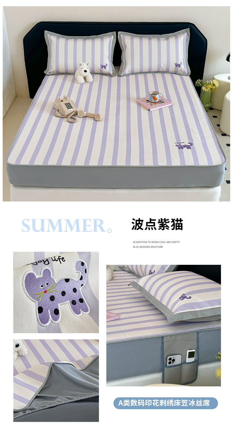 昔可家纺 2024新款数码印花刺绣床笠款冰丝席 条纹猫咪