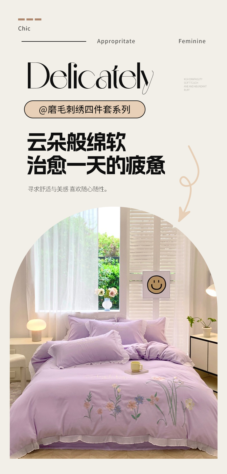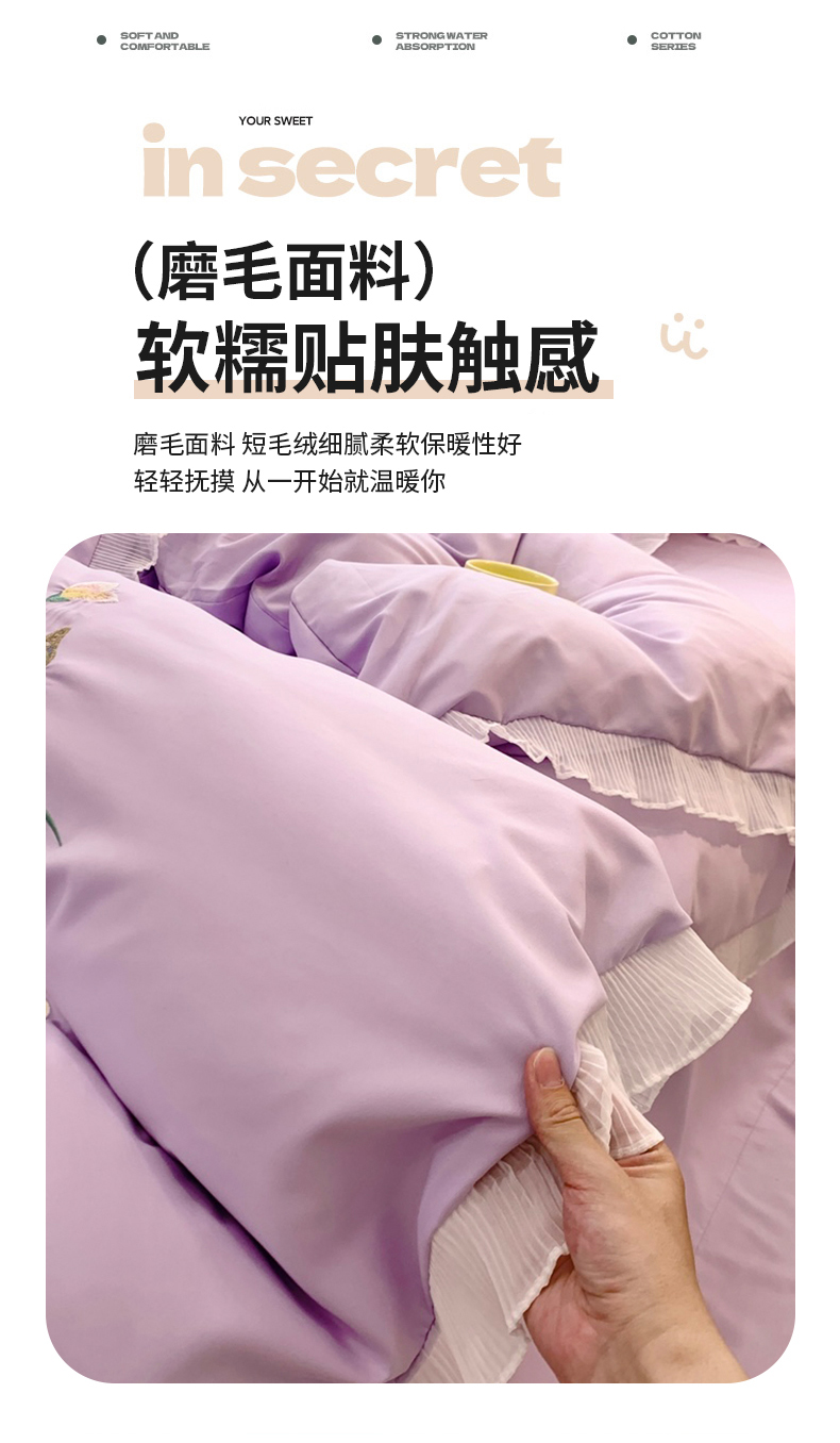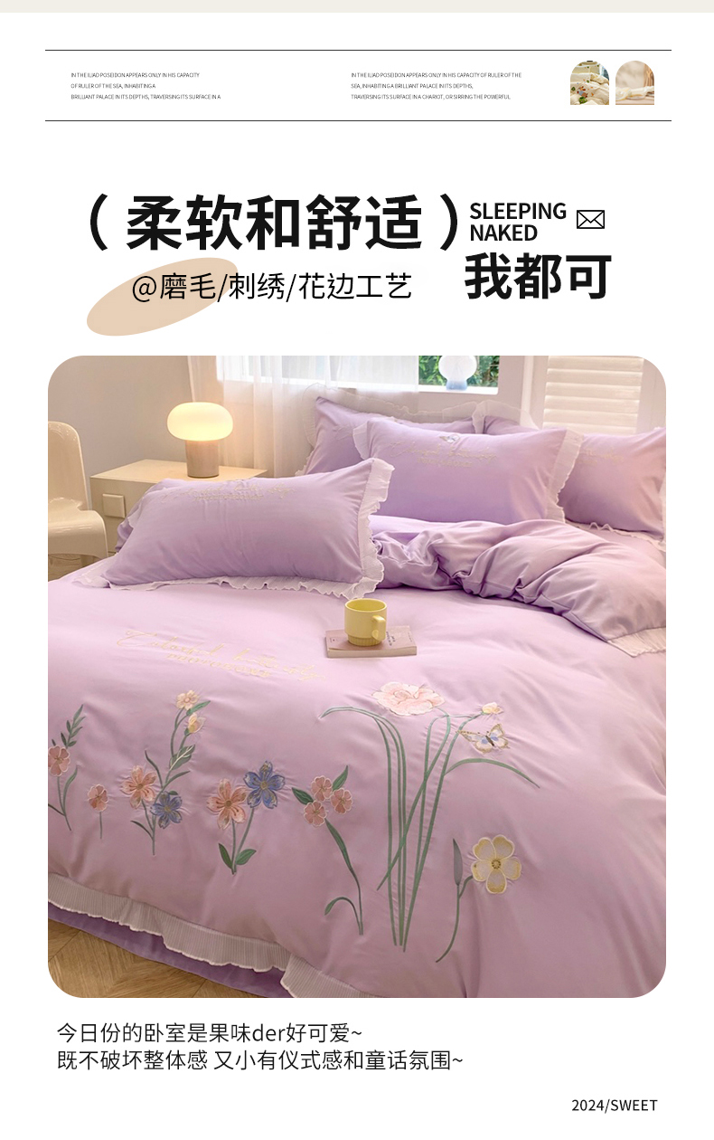 商品名称:(总)凯艾玲 2024新款简约轻奢磨毛细斜纹四件套-花之舞 紫色