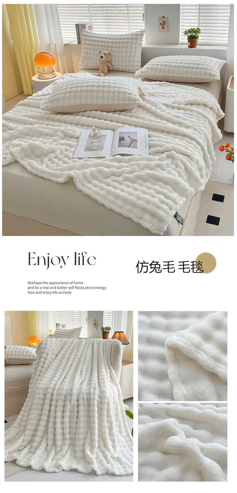 商品名称:芸锦豪 2024新款仿兔毛泡泡绒毛毯-卷边款毛毯 米白-卷边