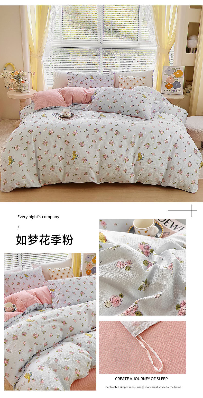 商品名称:氧家 2024新款水洗棉华夫格泡泡纱四件套 如梦花季粉