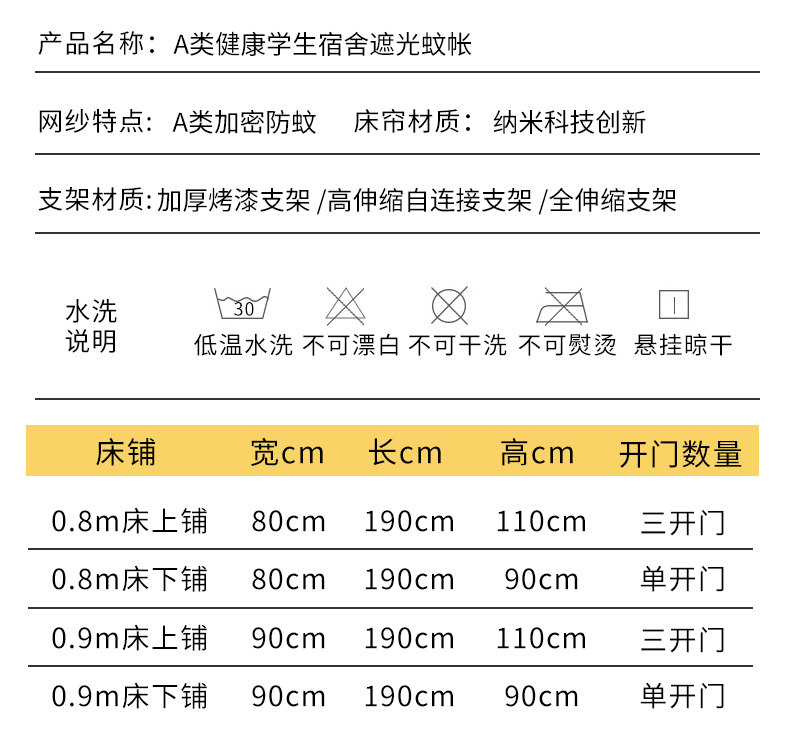 上铺80 ×190×(高90-115cm) (三开门)包含口袋帘(高伸缩免拼烤漆支架) | ¥100.00 |