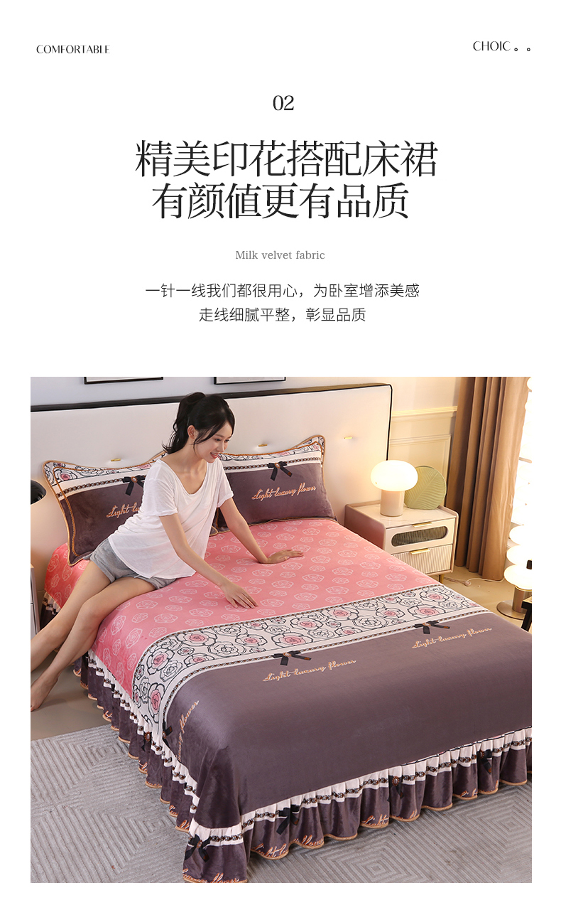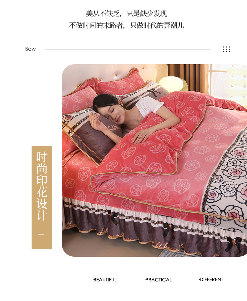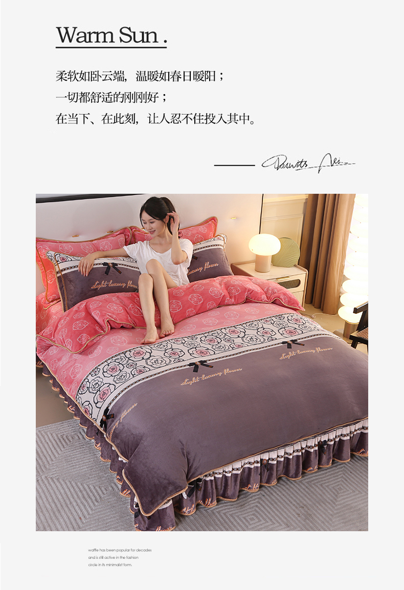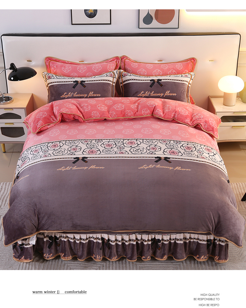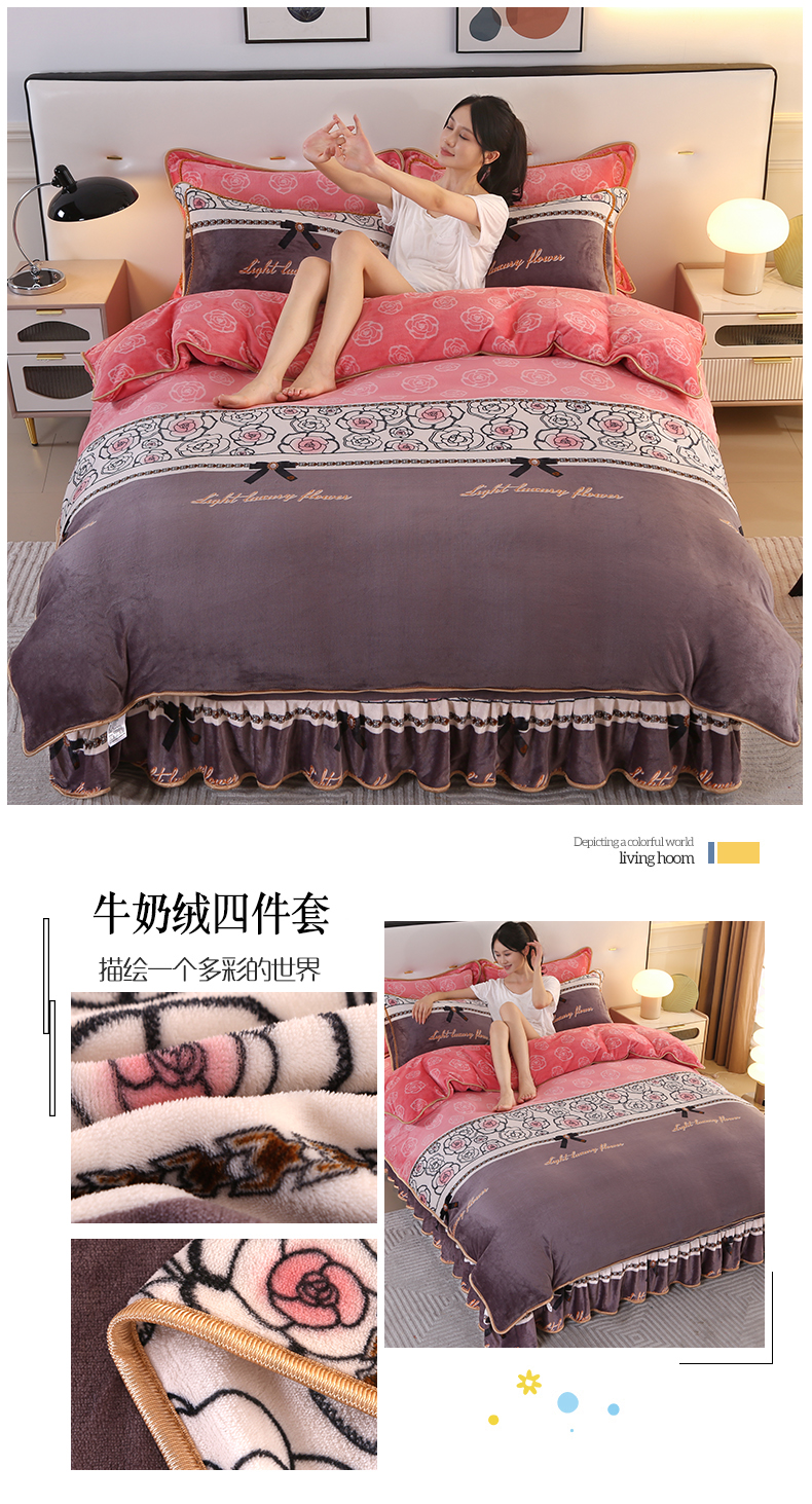 代芙家纺 7斤重牛奶绒金貂四件套抗静电法莱绒珊瑚绒床裙 柔情蜜语