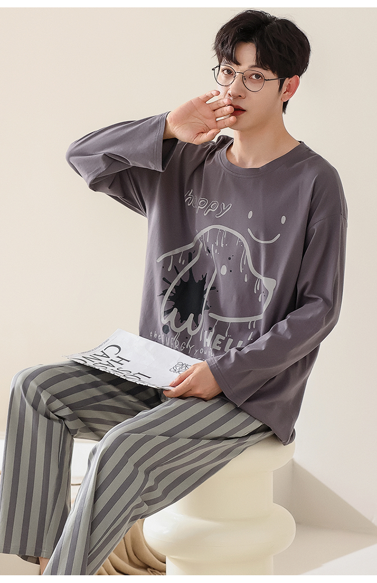 春秋季纯棉圆领睡衣男士卡通长袖家居服夏季青少年休闲可外穿套装 683男