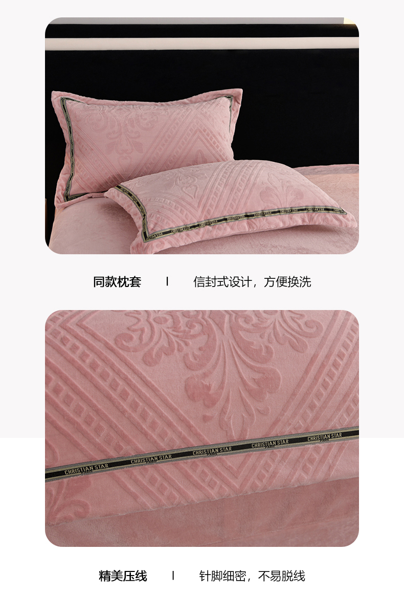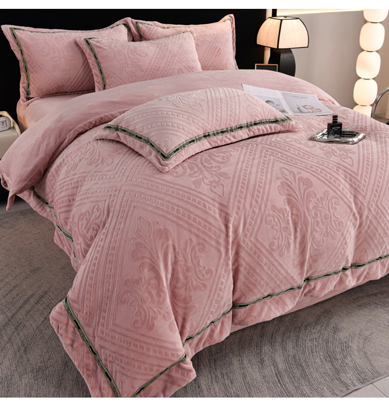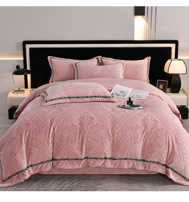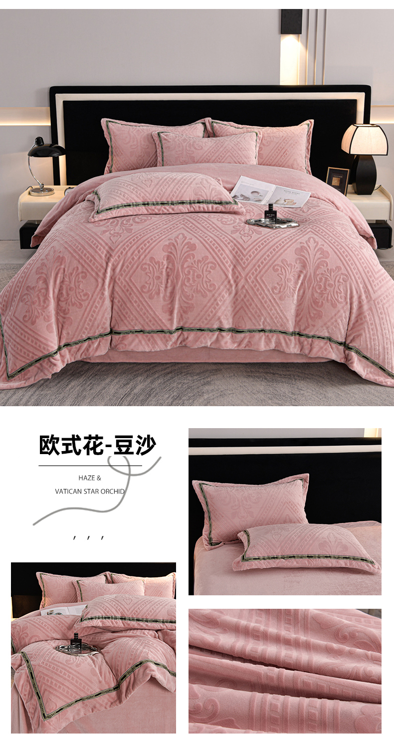 商品名称:妮恒美 2024新款牛奶绒四件套雕花压线款法莱绒四件套 欧式花-豆沙