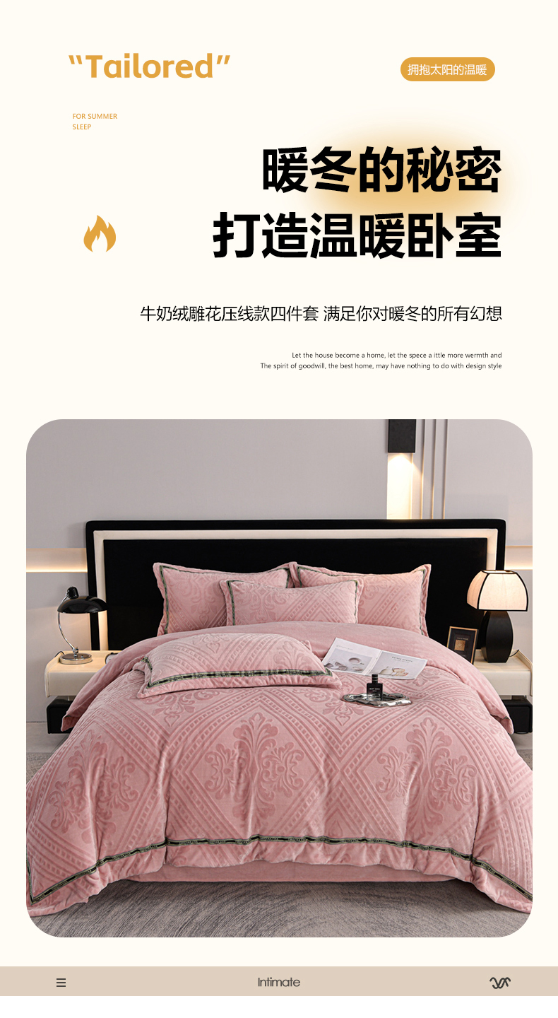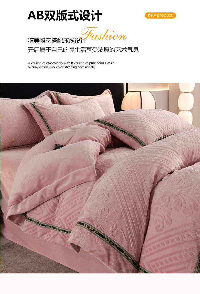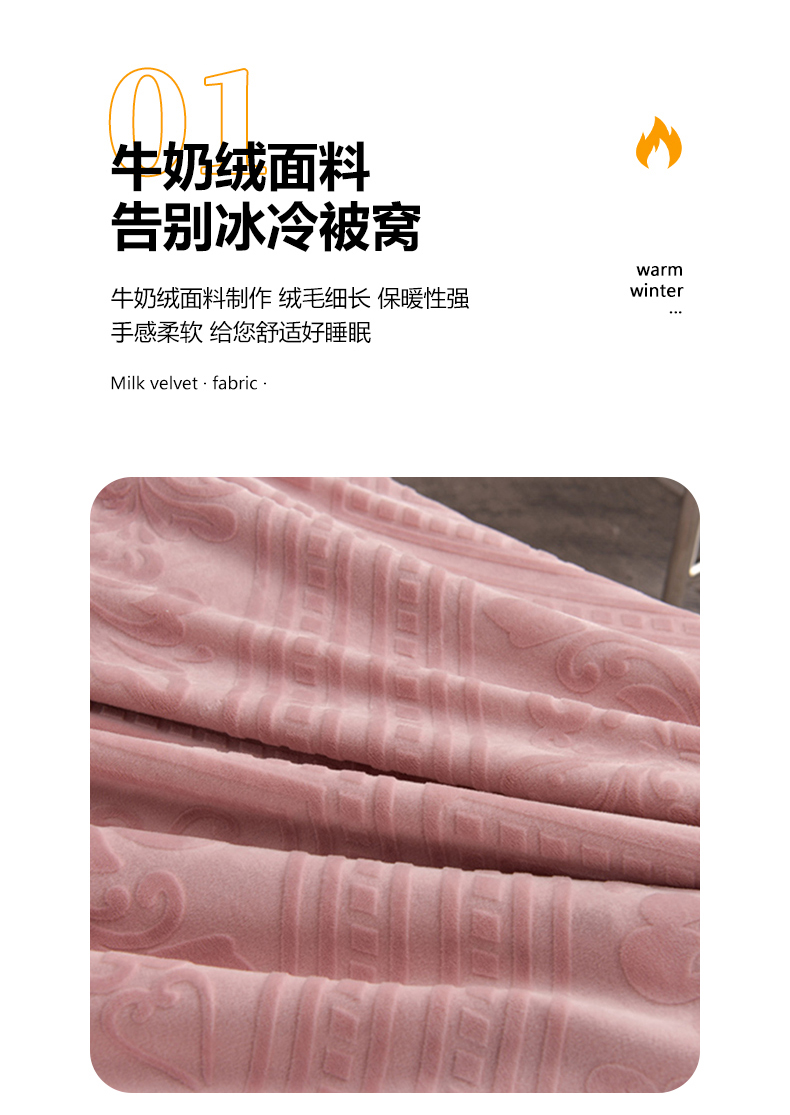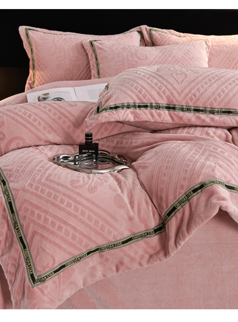 商品名称:妮恒美 2024新款牛奶绒四件套雕花压线款法莱绒四件套 欧式花-豆沙