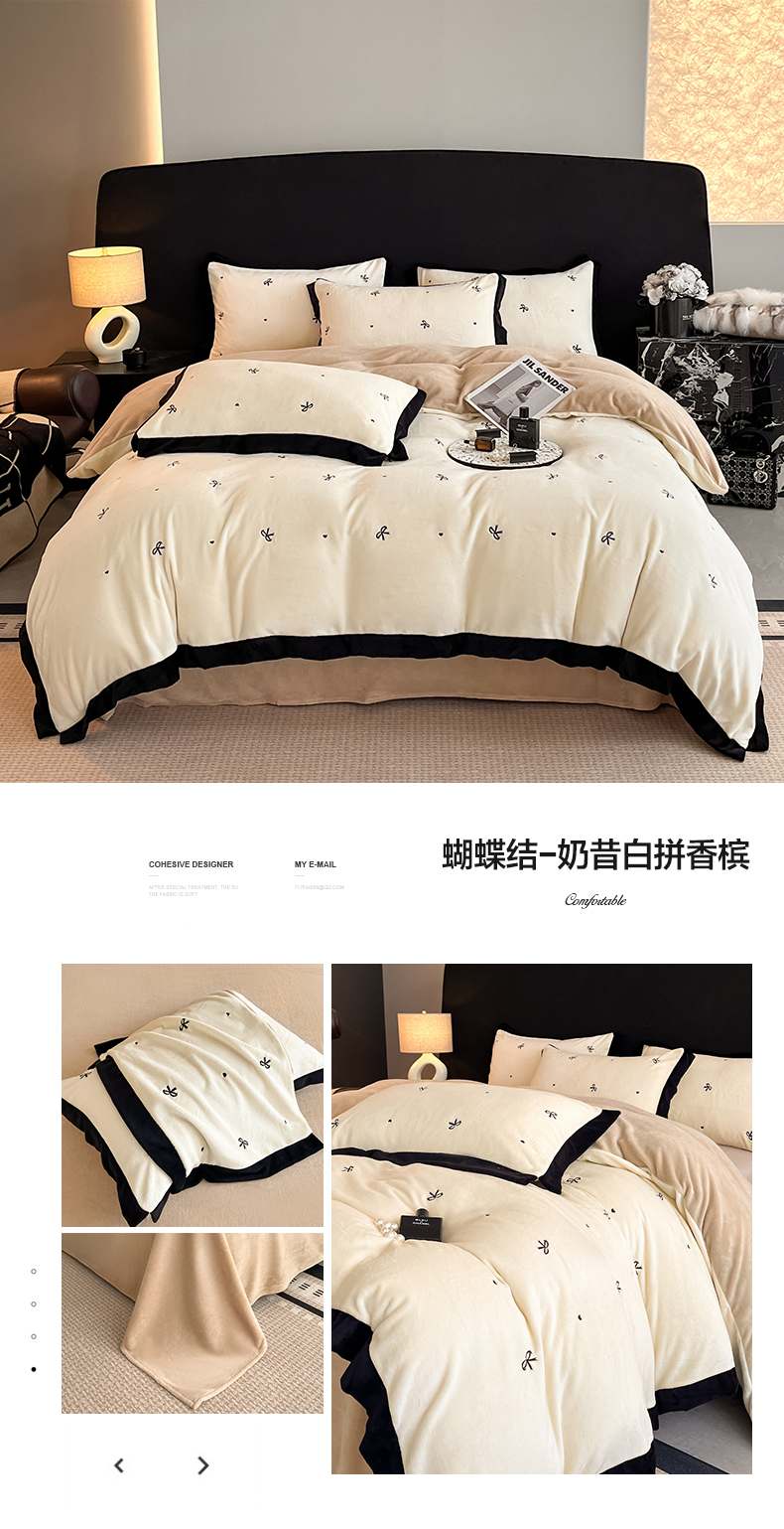 当前位置: 91家纺网 > 商品网购 > 床品套件 > 四件套 > 牛奶绒四件套 > 米彩家纺 2024新款A类轻奢风牛奶绒绣花四件套-爱心蝴蝶结系列 蝴蝶结-奶昔白拼香槟