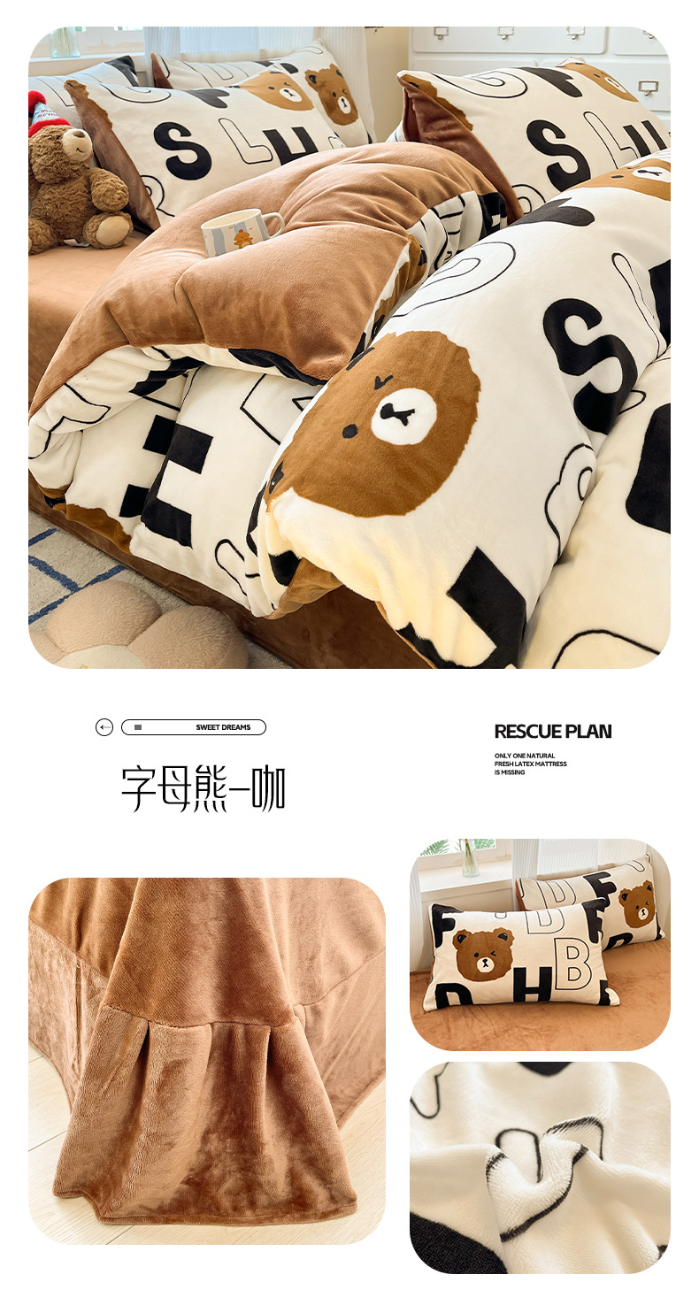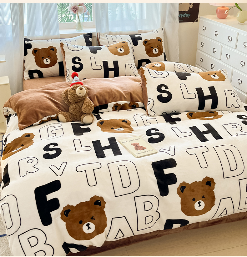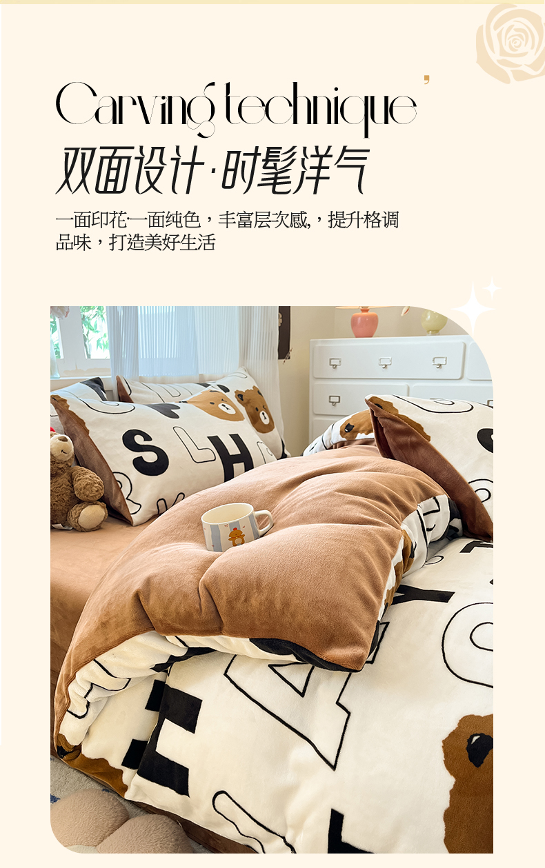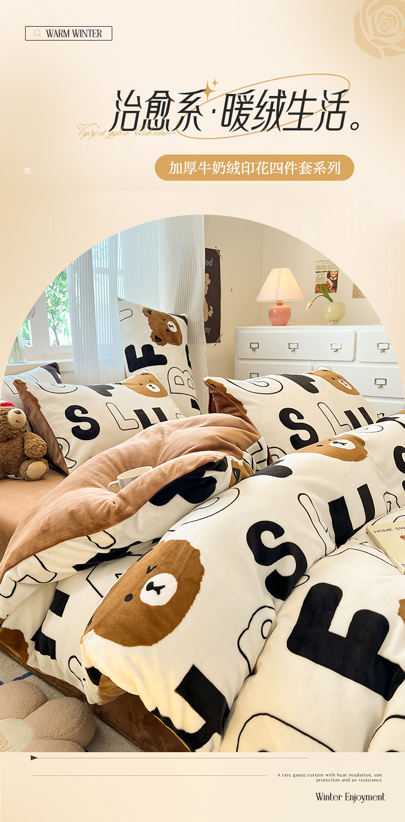 绘萱家居 2025新款高克重印花牛奶绒四件套 字母熊-咖