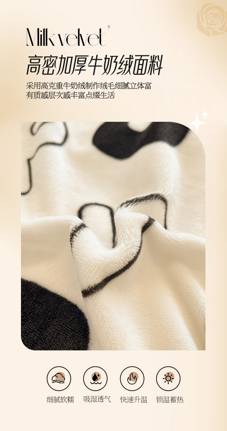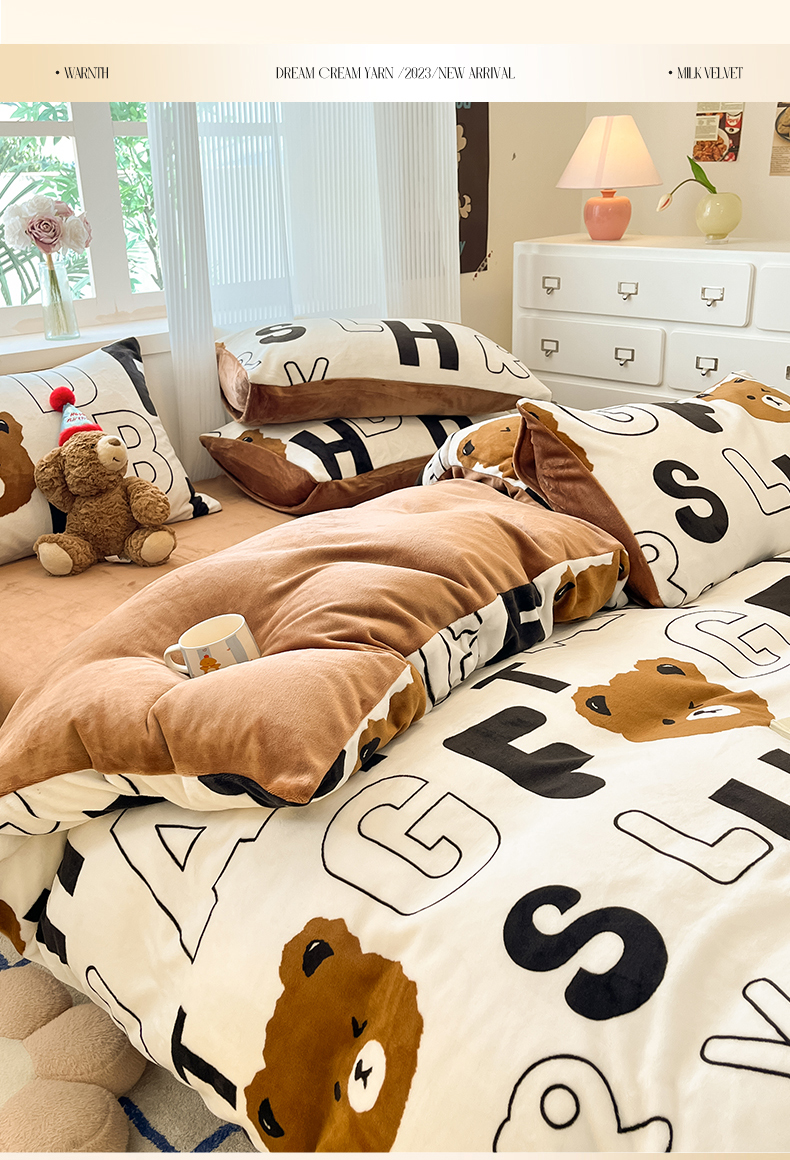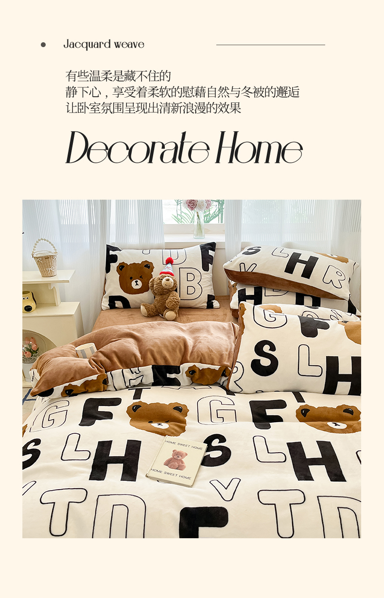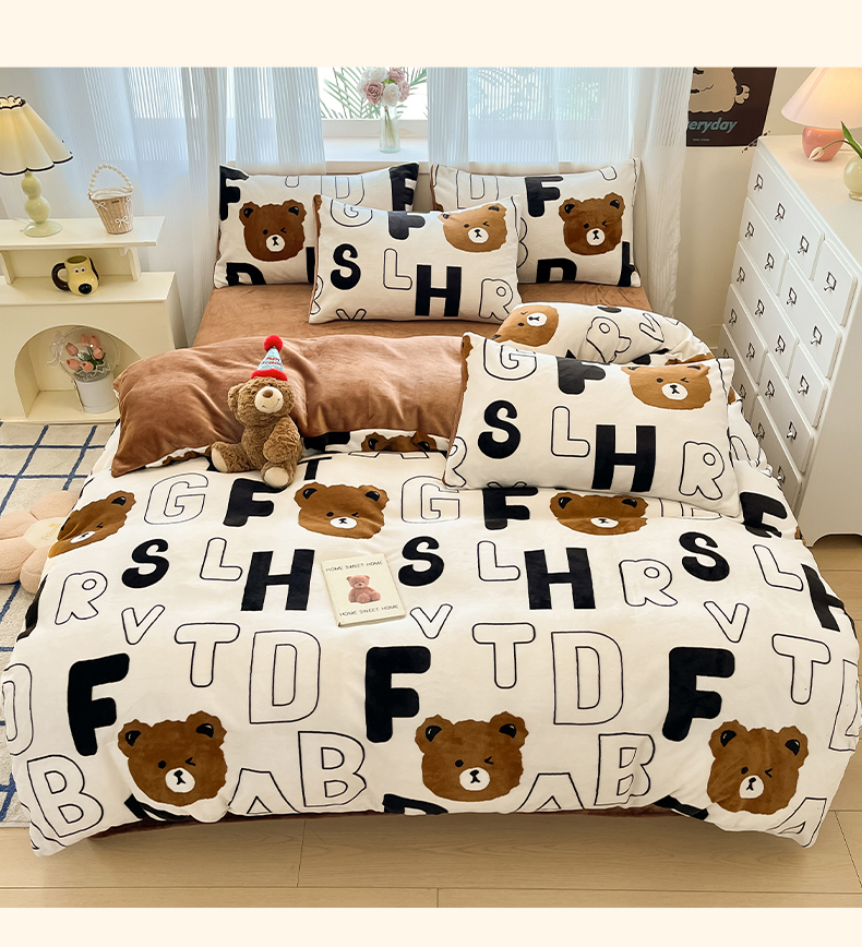 绘萱家居 2025新款高克重印花牛奶绒四件套 字母熊-咖