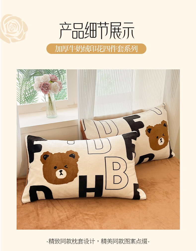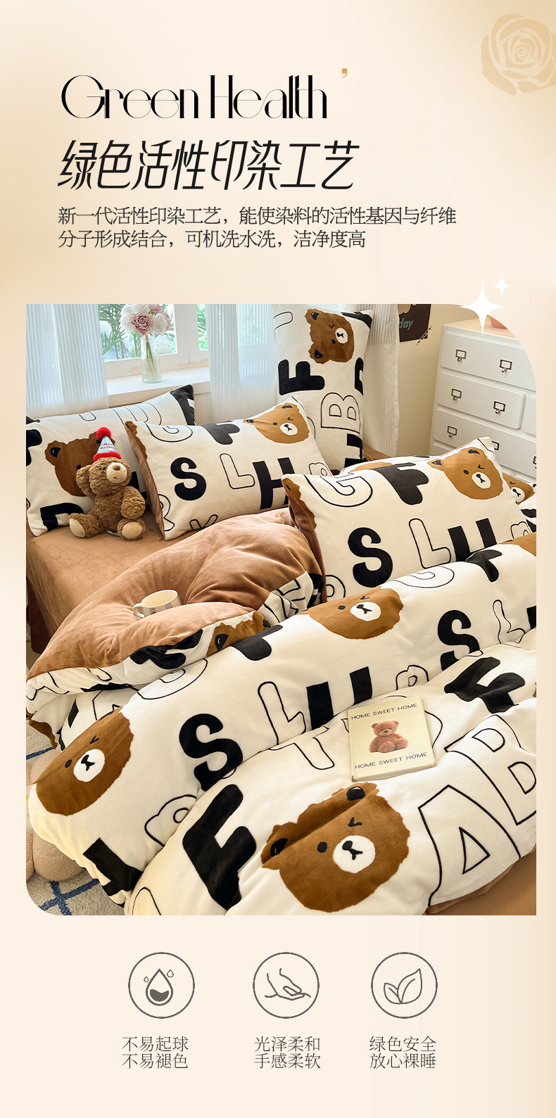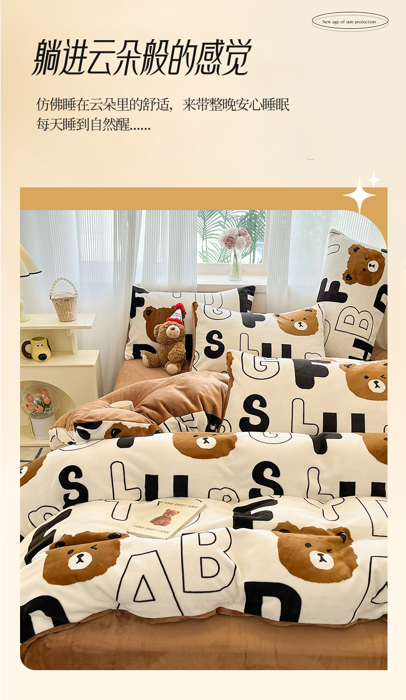 商品名称:绘萱家居 2025新款高克重印花牛奶绒四件套 字母熊-咖